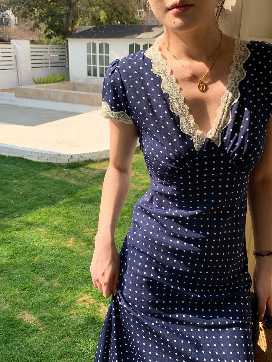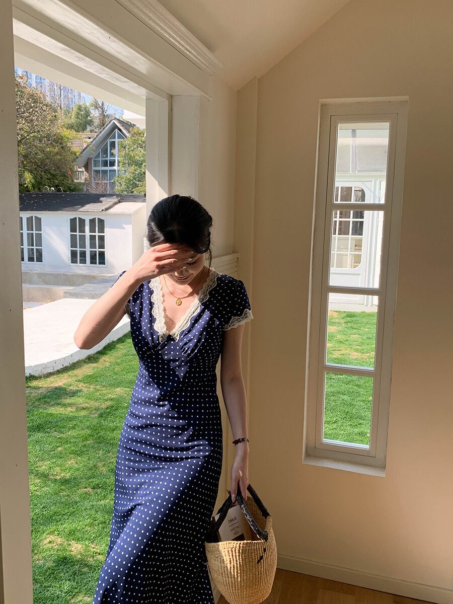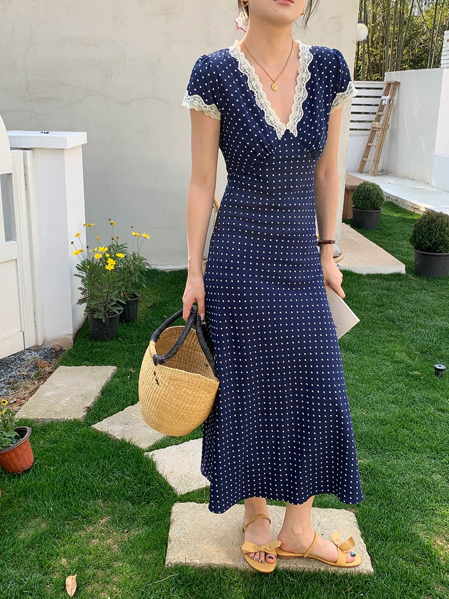 Vネックドット柄ワンピース Vネックレース ワンピース 春 夏 レディース 半袖 Vネック レース切り替え ロング丈 ワンピース きれいめ ドット柄 ワンピース フェミニン 水玉柄 春夏 Aライン ワンピース 大人かわいい お洒落 着痩せ シンプル 華奢見え 薄手 カジュアル 通勤 OL 20代 30代 40代 C641