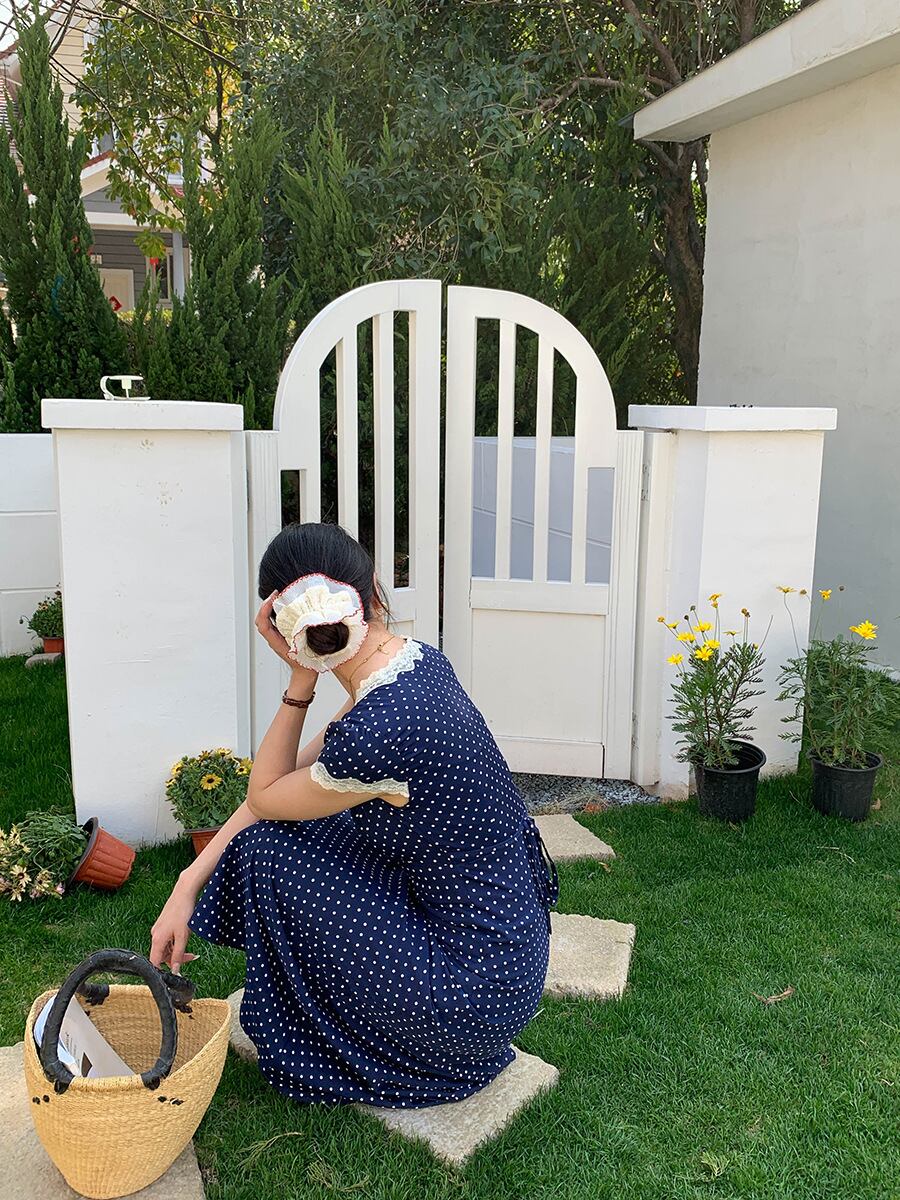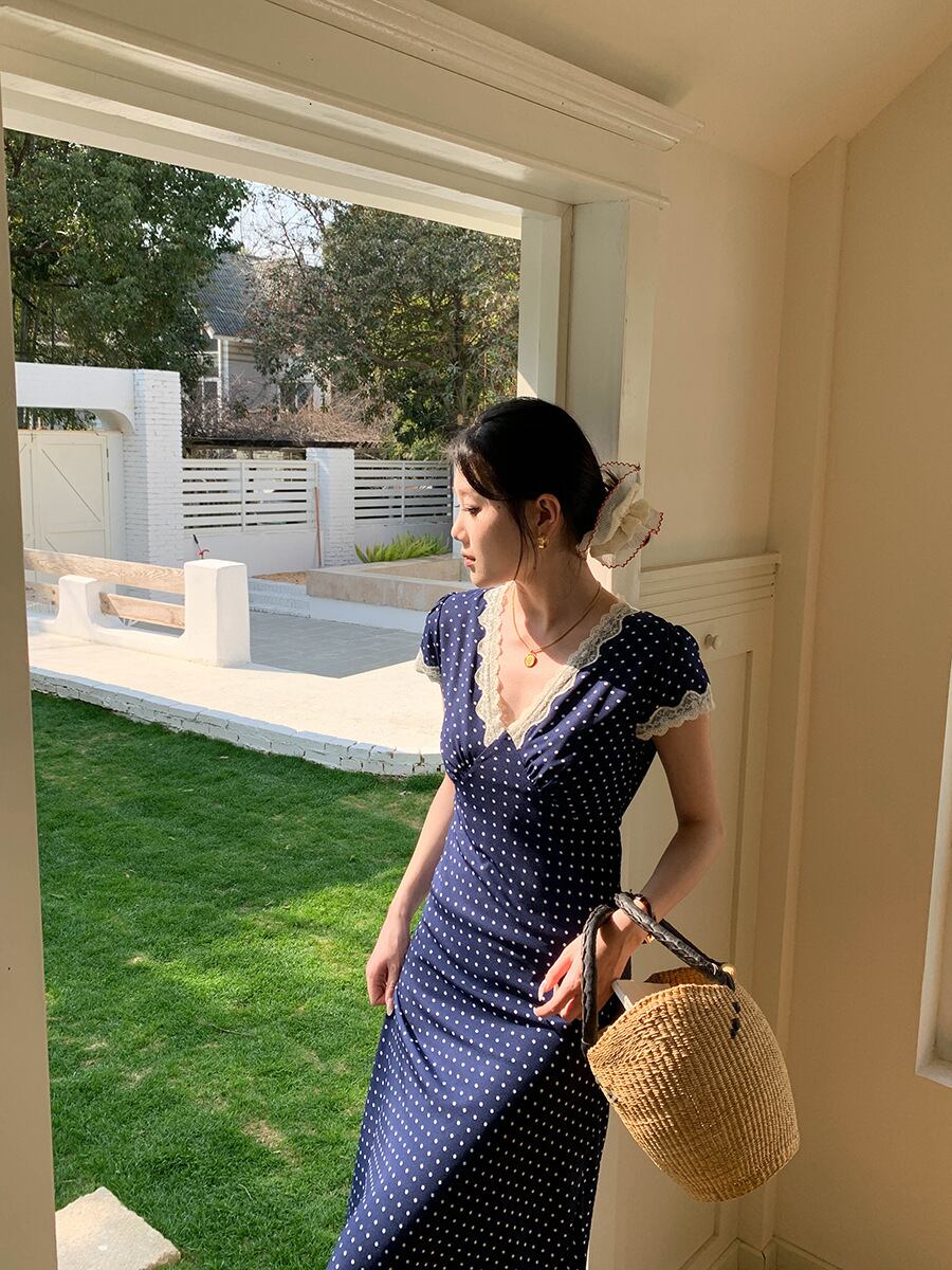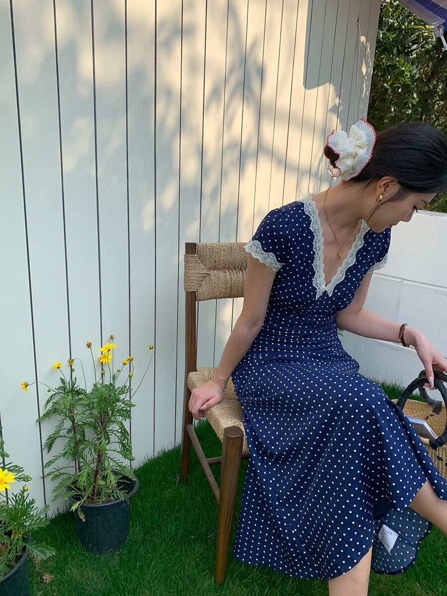 Vネックドット柄ワンピース Vネックレース ワンピース 春 夏 レディース 半袖 Vネック レース切り替え ロング丈 ワンピース きれいめ ドット柄 ワンピース フェミニン 水玉柄 春夏 Aライン ワンピース 大人かわいい お洒落 着痩せ シンプル 華奢見え 薄手 カジュアル 通勤 OL 20代 30代 40代 C641
