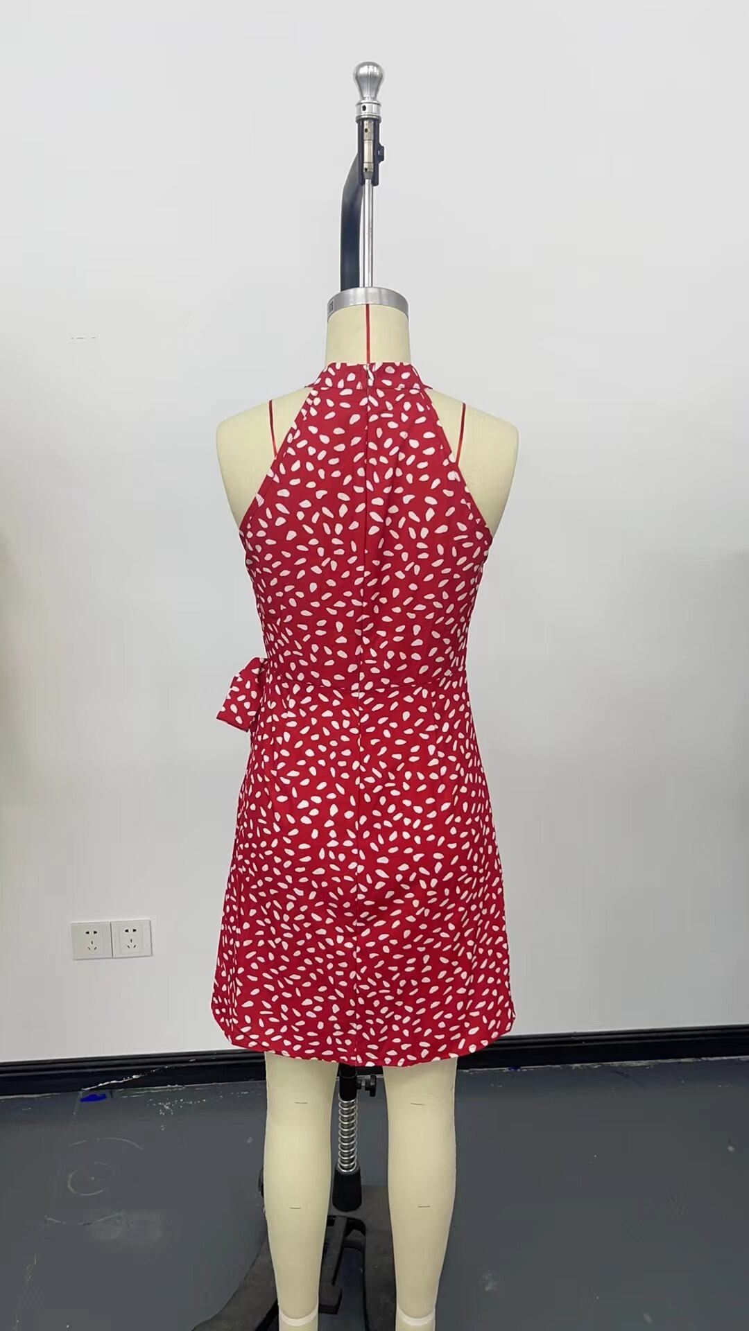 ドット柄ホルターネックワンピース レディース 夏 総柄 ウエストリボン アメスリワンピース ノースリーブ ホルターネック ドレス ワンピース エレガント ドレス C675