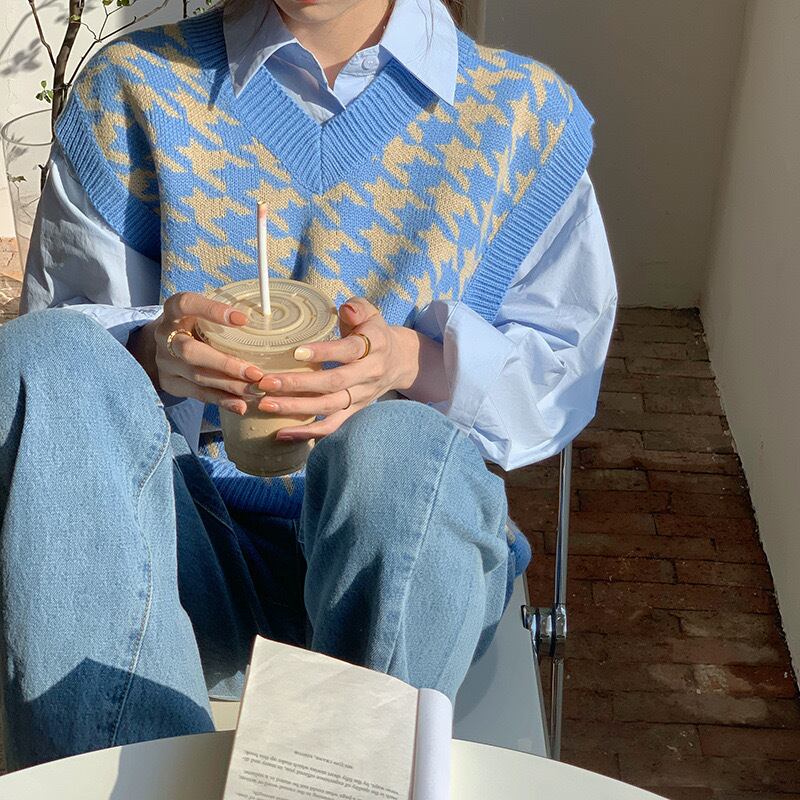 Vネック千鳥格子ニットベスト ニットベスト ベスト チェック柄 セーターベスト レディース ノースリーブ ベストジャケット 学生. オフィスコーデ オルチャン C718