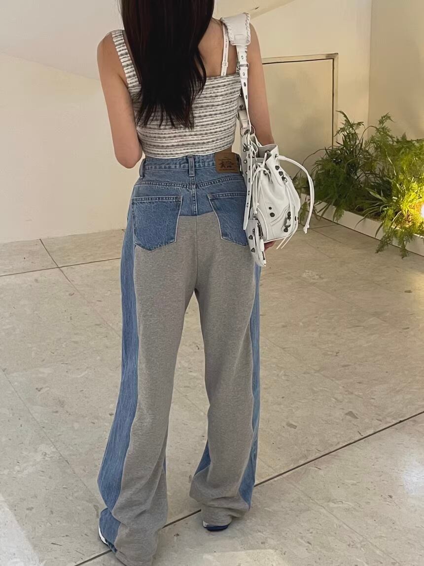 【Lサイズ♪1点のみ特別価格の4980円】異素材MIXダメージデニム スウェット×デニム デニム スウェット ボトムス カジュアル ストリート アメカジ ユニセックス 切り替え バイカラー 配色 体型カバー a4726