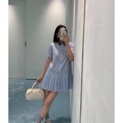 爽やかなストライプ柄に、裾はプリーツ風のフレアデザインで動くたびにふんわりと広がり、フェミニンさを引き立てます。
