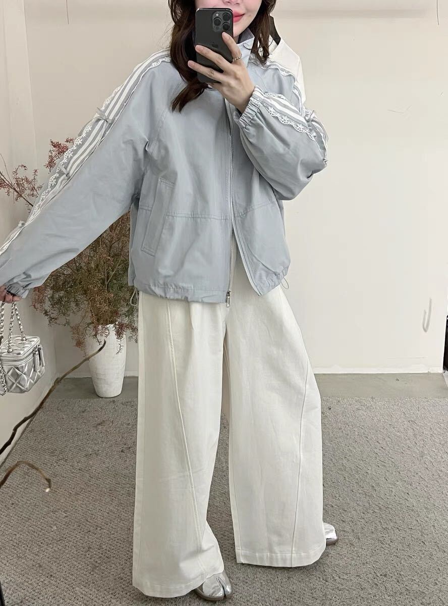 袖のレースラインとリボンディテールが目を引く、女性らしさ満点のトラックジャケット風ブルゾンが登場。