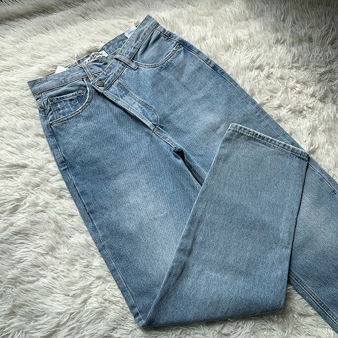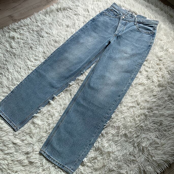 斜めウエストデザインが目を惹く、トレンド感たっぷりの美脚デニムパンツが登場✨
