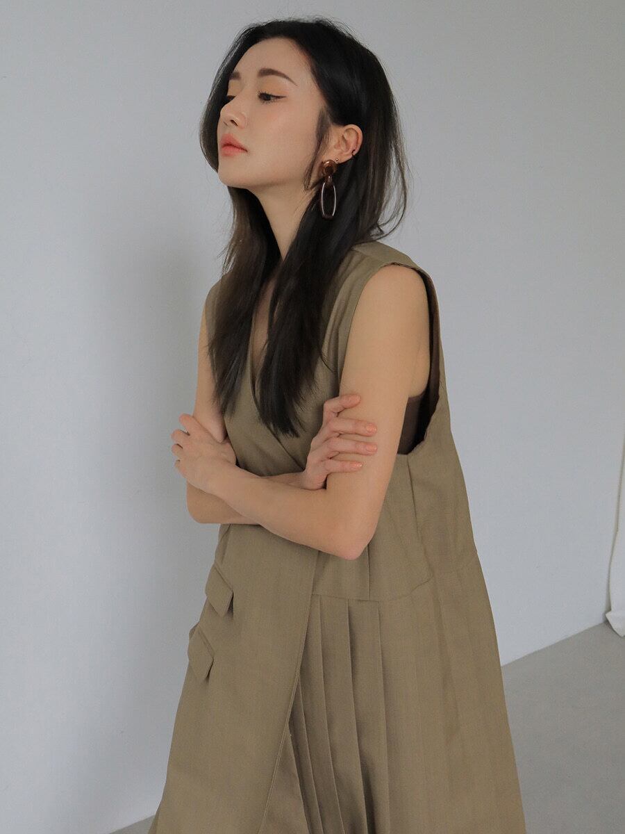 アシンメトリープリーツロングジレ ジレ ワンピース ロング レディース 春秋 テーラードベスト プリーツ 韓国風 ノースリーブ 通勤 大人 体型カバー トレンド 体型補正 C510