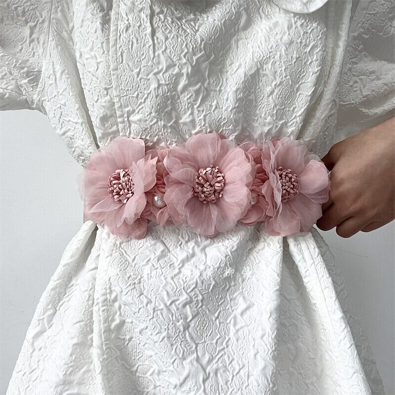 立体的なシフォン素材のフラワーとクラシックなデザインが美しい、太めタイプのウエストベルト。
