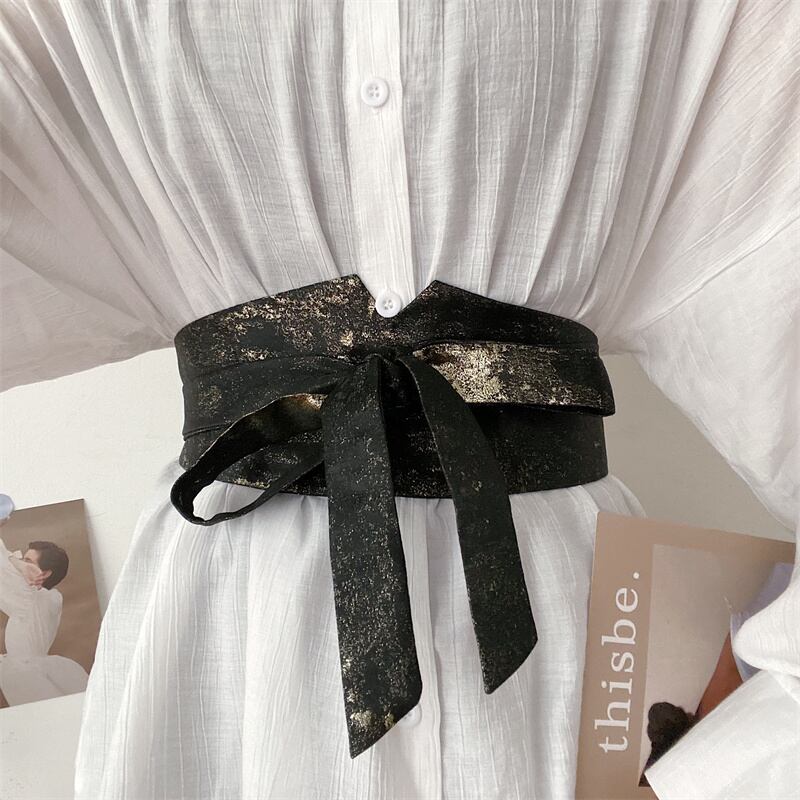 和の美しさとモダンな感性が融合した、着物風の帯デザインが魅力のワイドサッシュベルトです。
