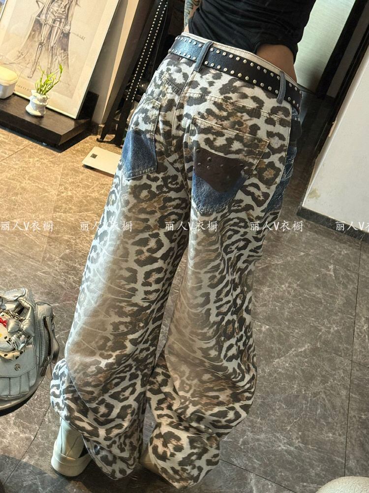 レオパード柄 ワイドデニムパンツ ヴィンテージ風 ローウエスト デニム ジーンズ 個性派 ストリート 大きめサイズ 海外ファッション レディース Y2K C428