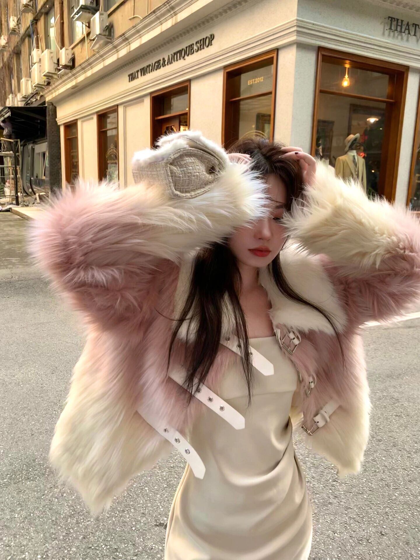 グラデーションピンクフェイクファーコート フェイクファーコート ピンク×ホワイトグラデーション アウター 冬 フェイクファー レディース コート ピンクアウター グラデーション 冬服 海外ファッション ガーリー 高見え オシャレアウター Y2K C433