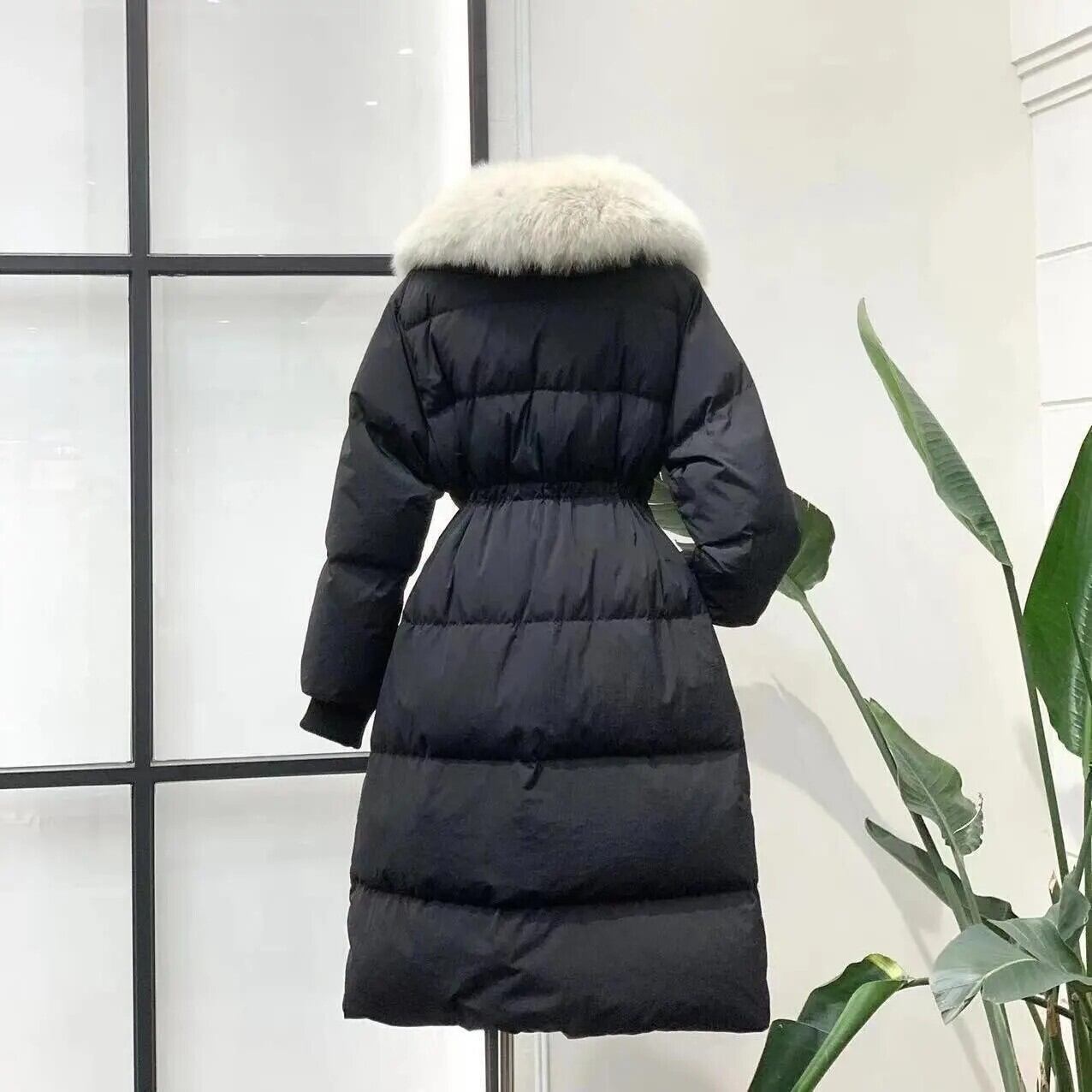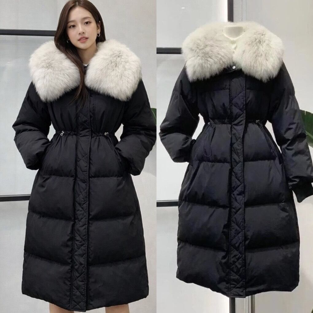 お顔周りのファーが上品な印象を与える、クラシックで女性らしいロングダウンコート