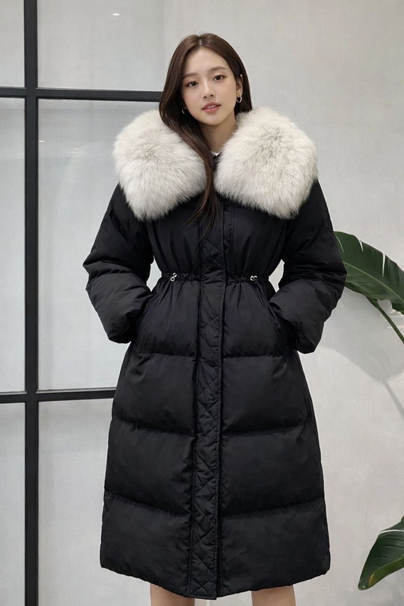 上品なネックファーとブラックボディのコントラストが、洗練された大人の冬コーデを演出します。