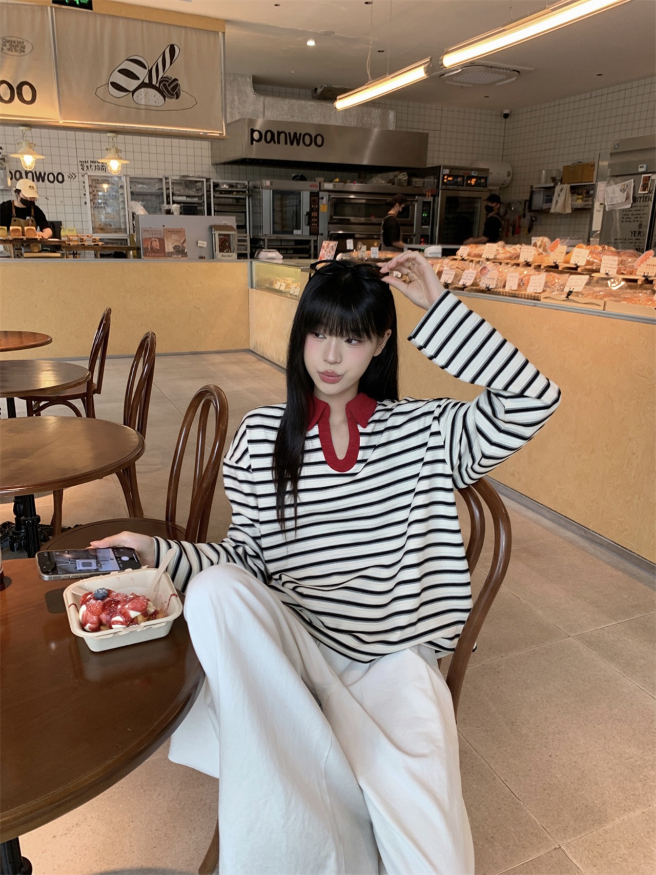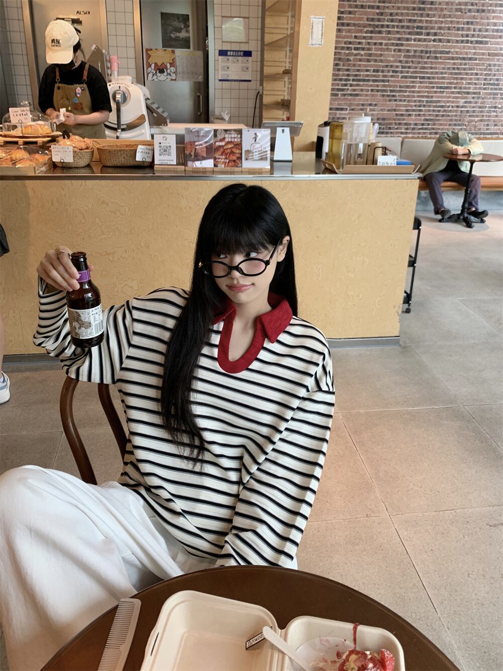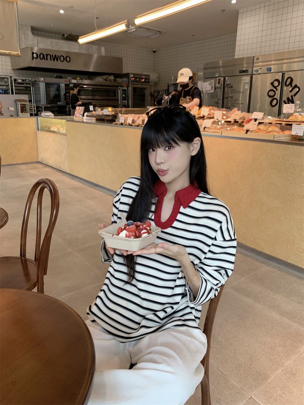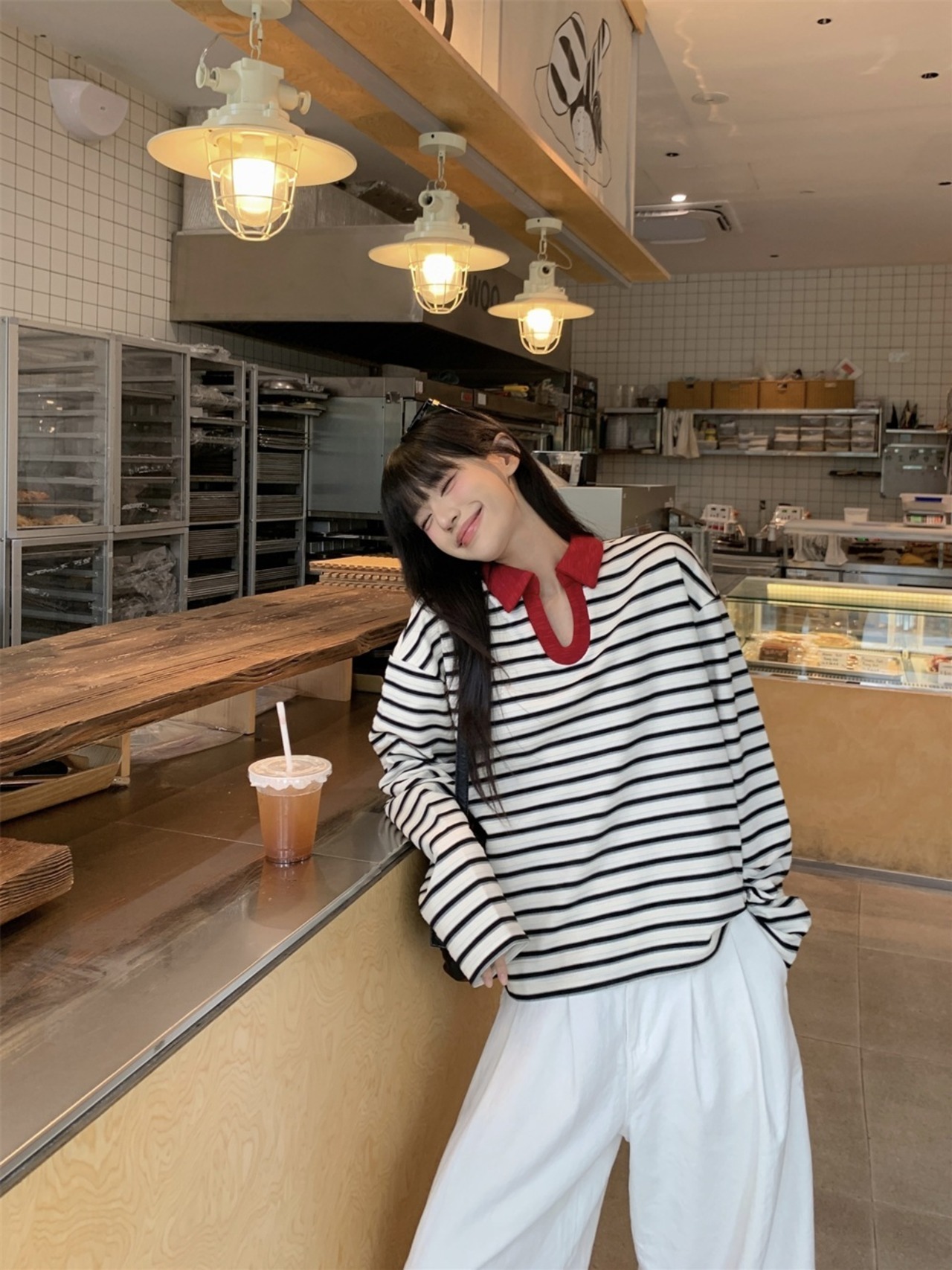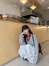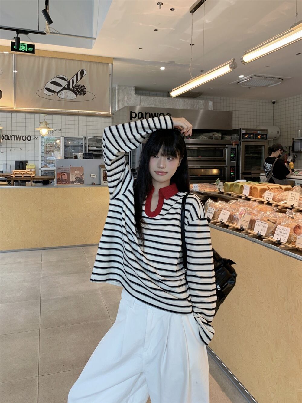 赤襟×白黒ボーダー、ベージュ襟×黒白ボーダーの2カラー展開で、着るだけで一気に韓国風カジュアルコーデが完成します。