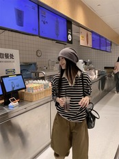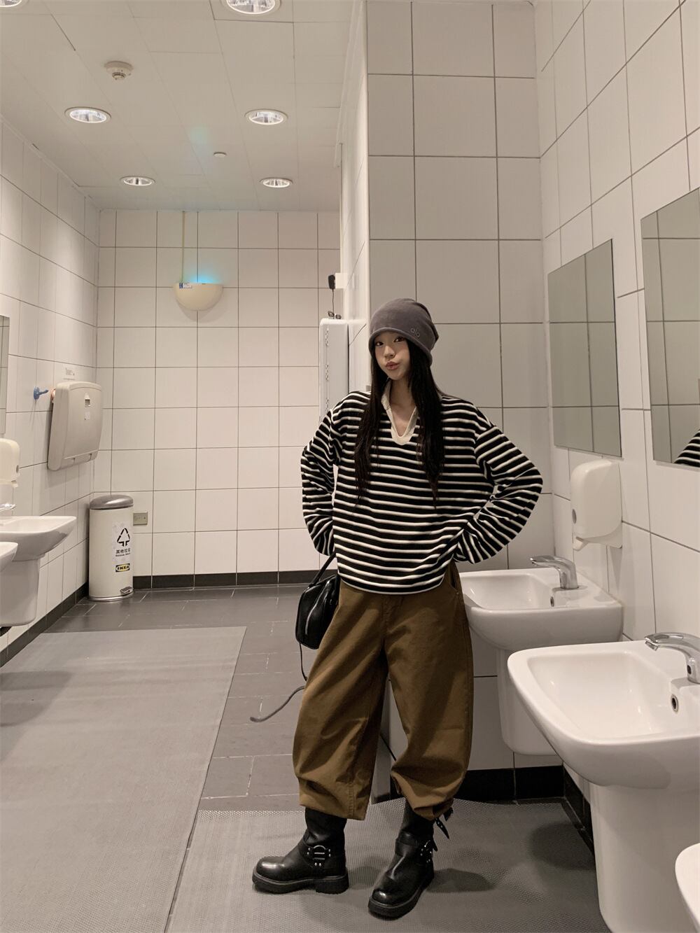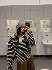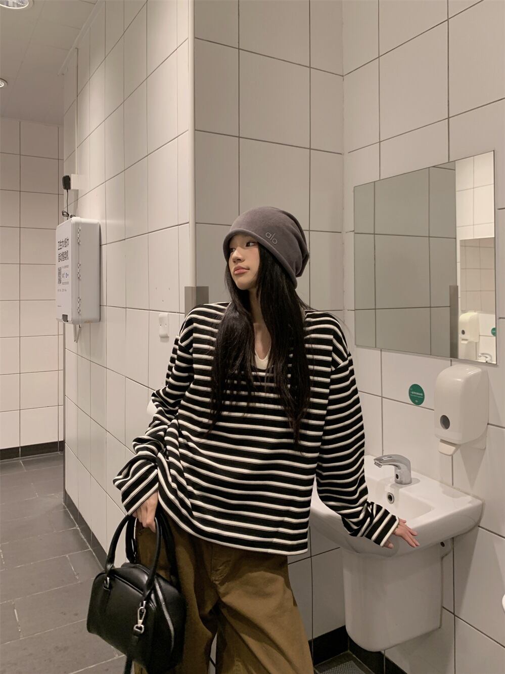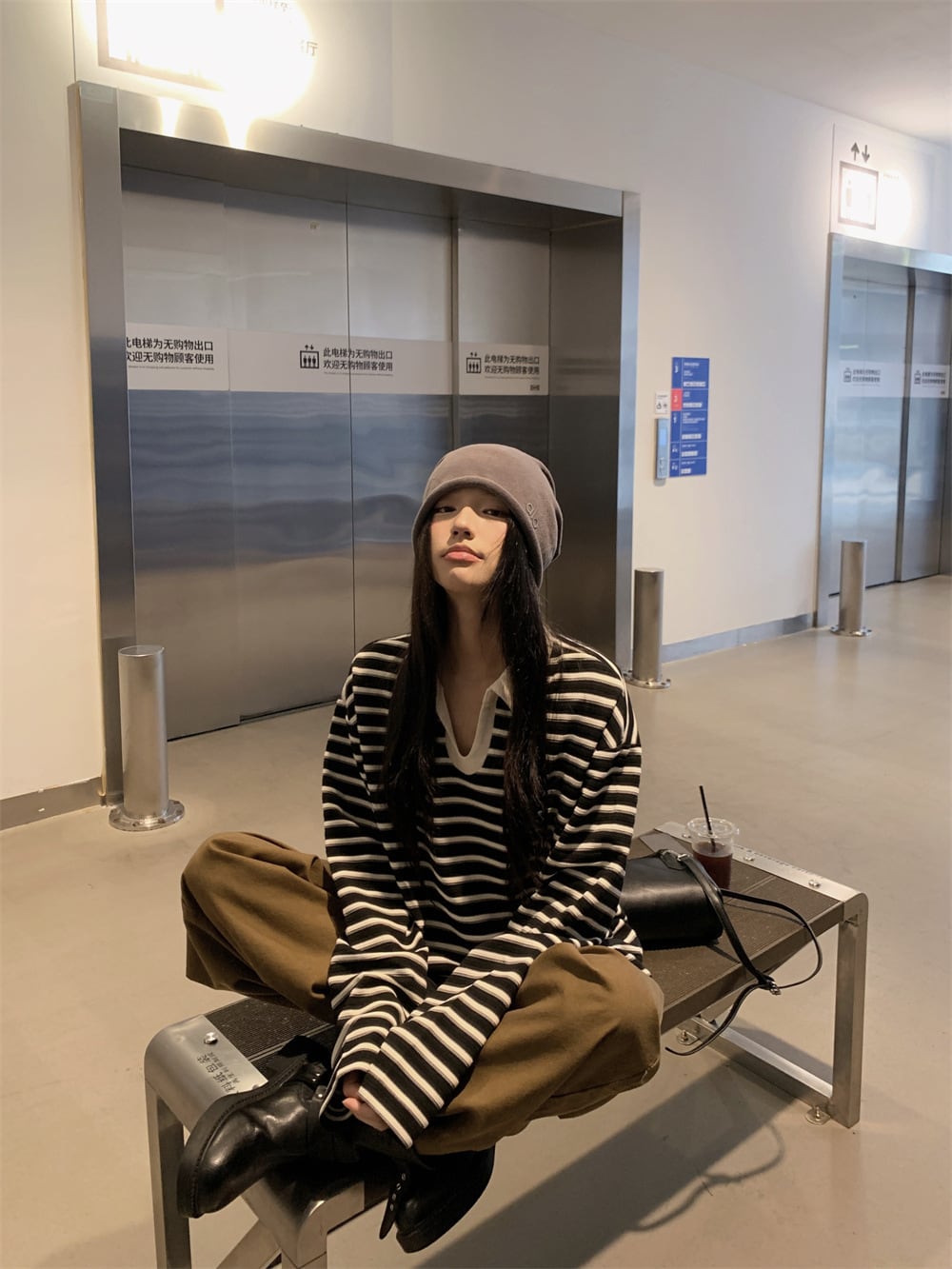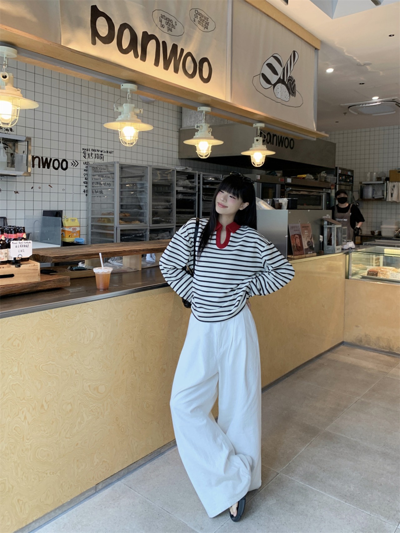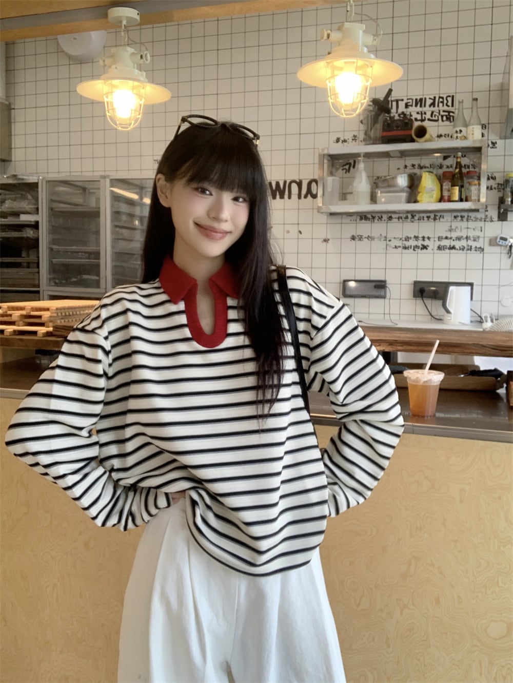 赤襟×白黒ボーダー、ベージュ襟×黒白ボーダーの2カラー展開で、着るだけで一気に韓国風カジュアルコーデが完成します。