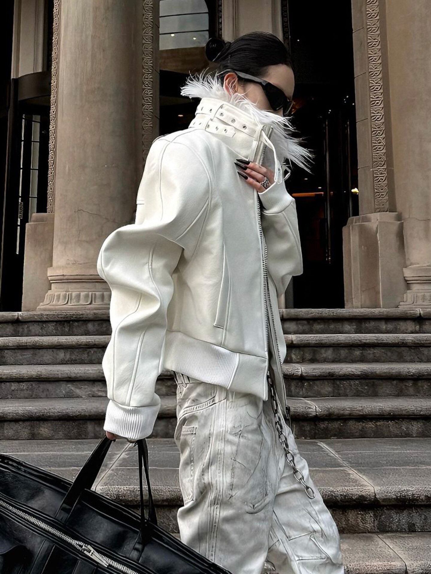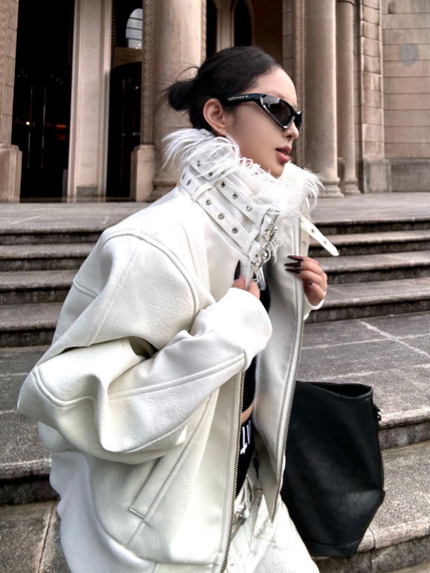 フェザーカラーボリュームホワイトレザージャケット ショートジャケット フェイクレザー ライダースジャケット レザージャケット レディース ハイネック ジップアップ ブルゾン モード系 オーバーサイズ 秋冬アウター ホワイト C394