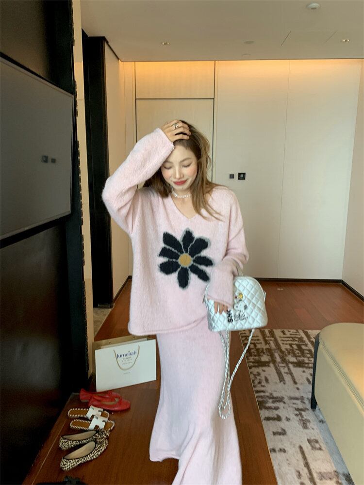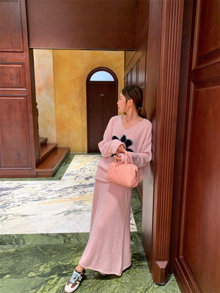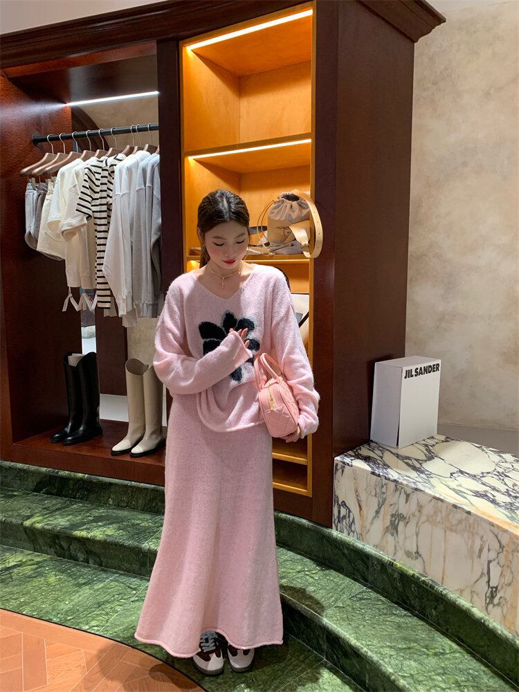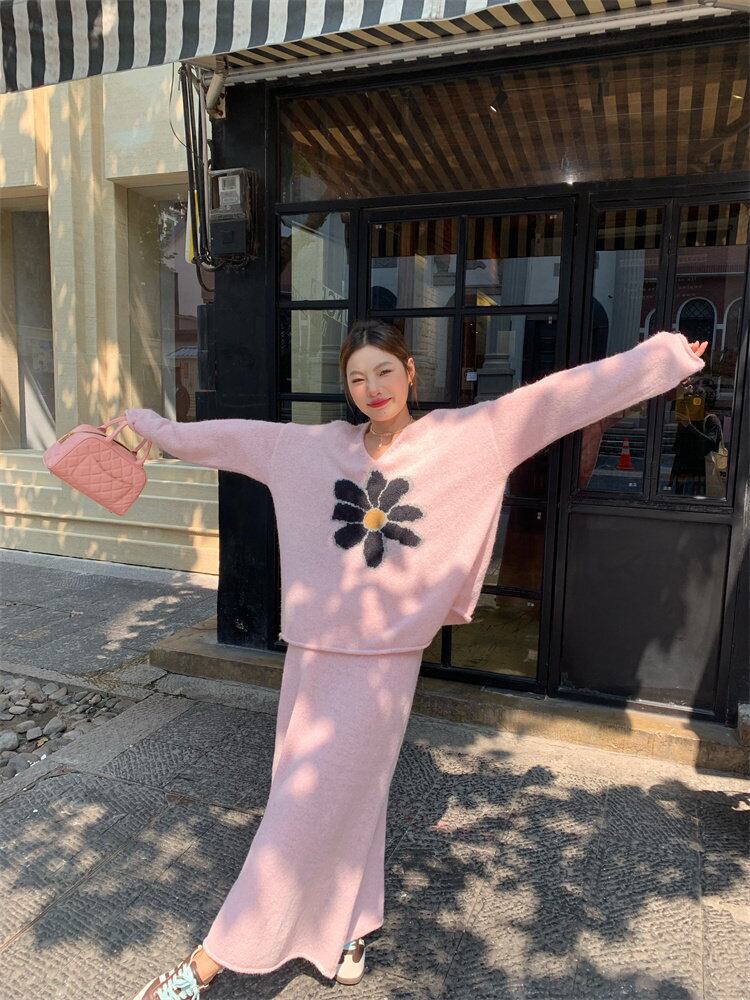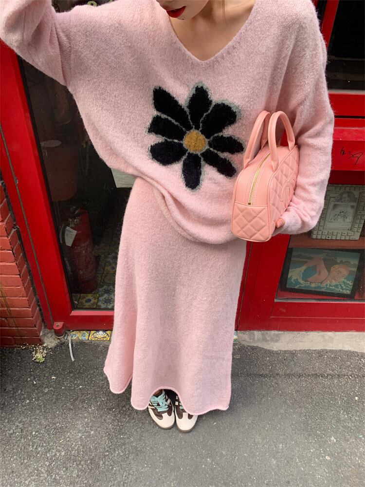 【セットアップ】Vネックセーター+ニットスカート 花柄ニットアップ レディース 秋冬 Vネック セーター ロングスカート 上下セット ピンク ふんわり フェミニン 体型カバー a4707