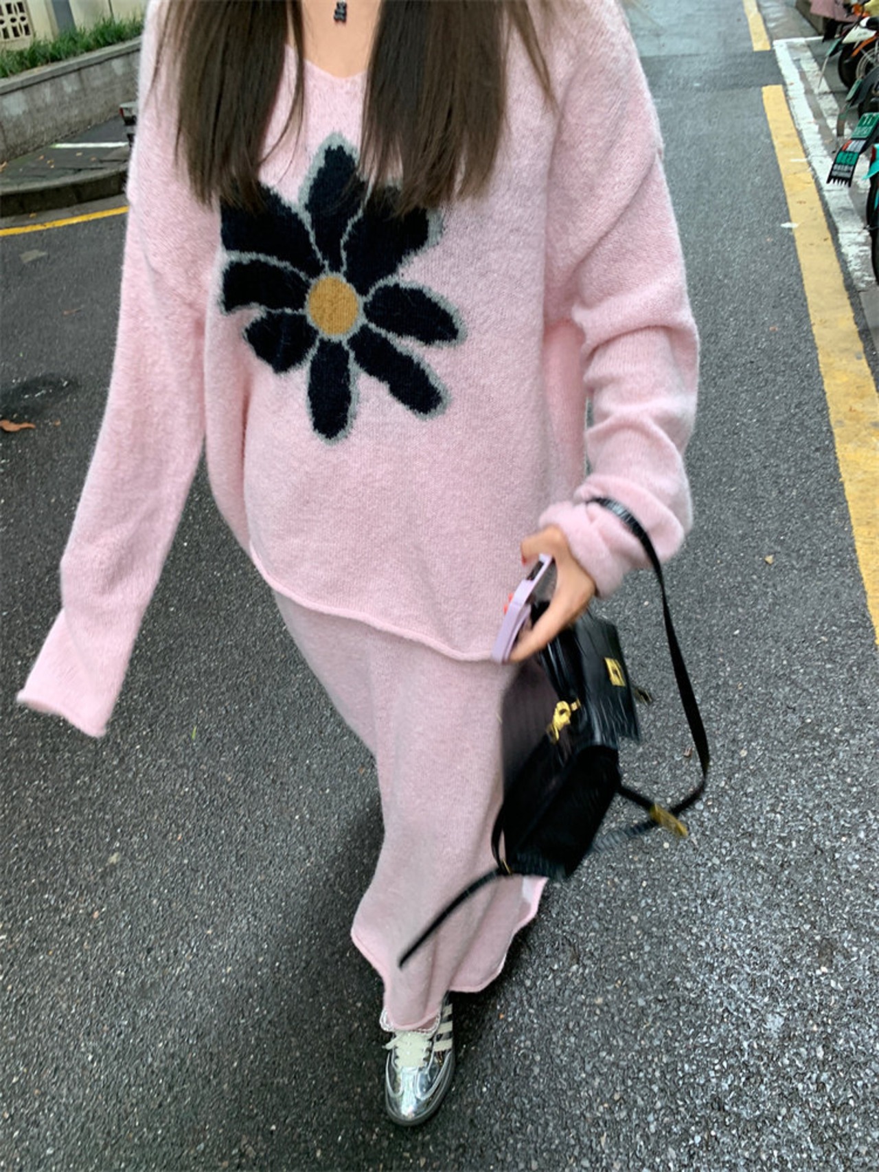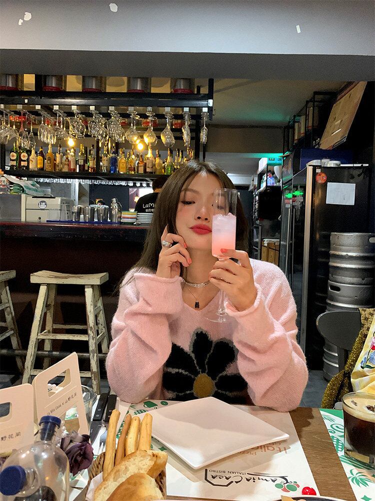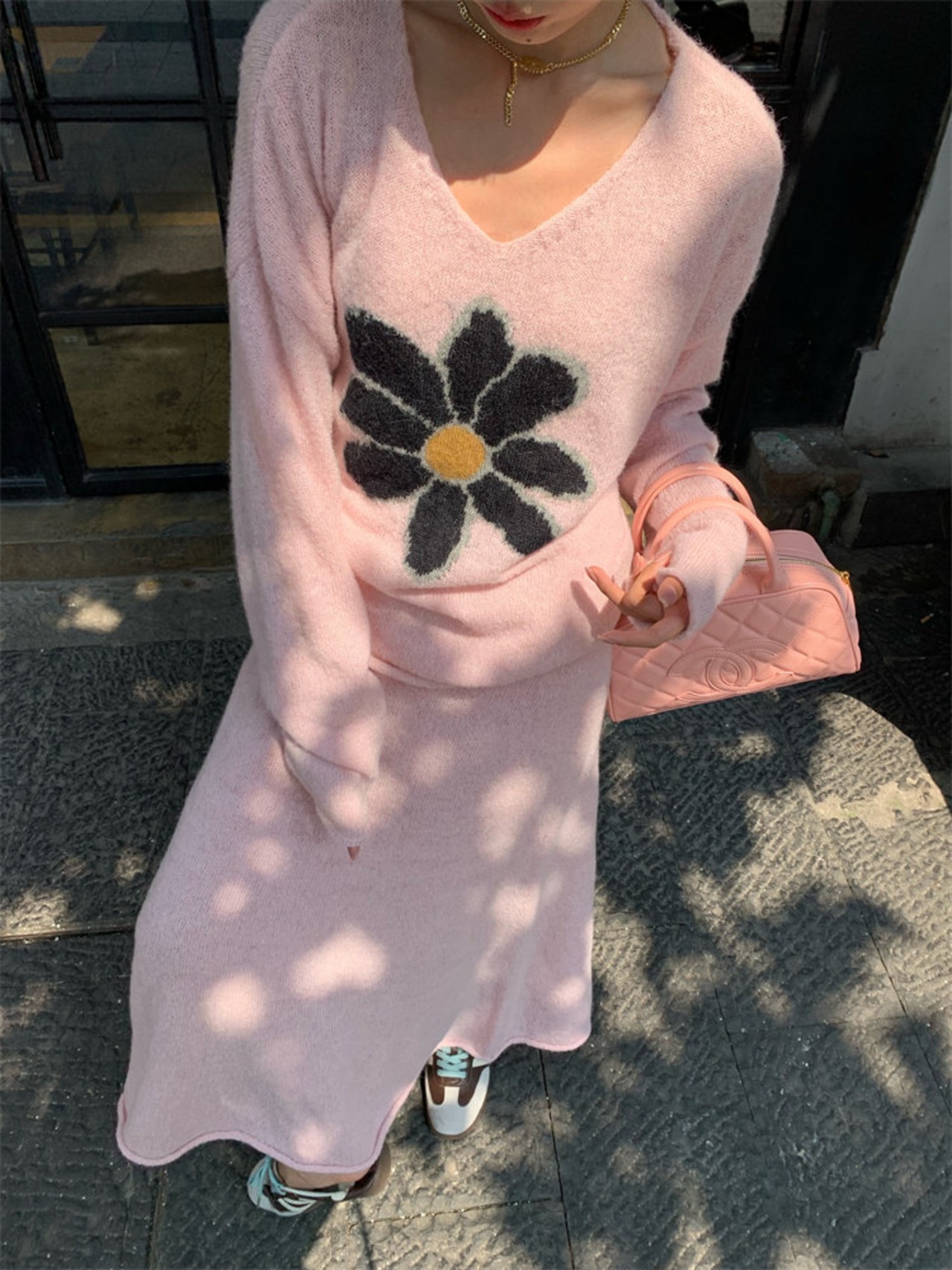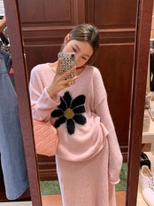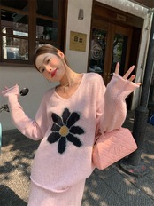 【セットアップ】Vネックセーター+ニットスカート 花柄ニットアップ レディース 秋冬 Vネック セーター ロングスカート 上下セット ピンク ふんわり フェミニン 体型カバー a4707