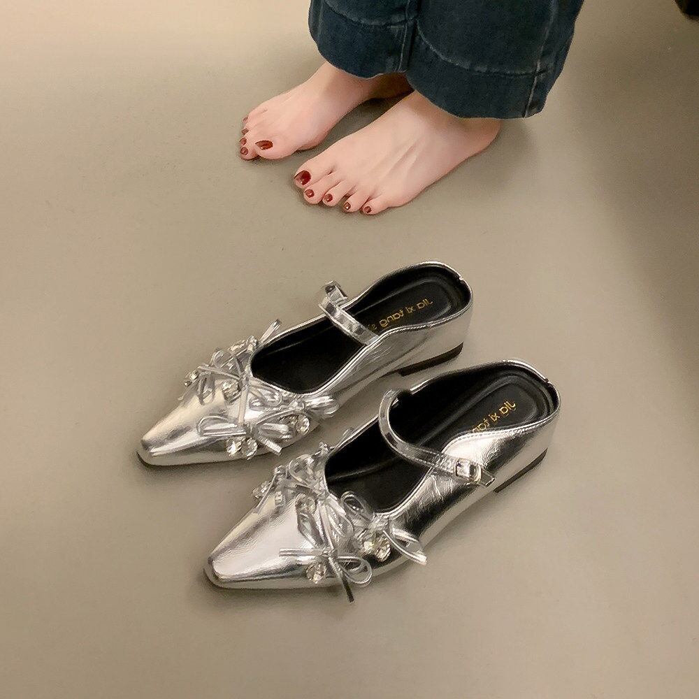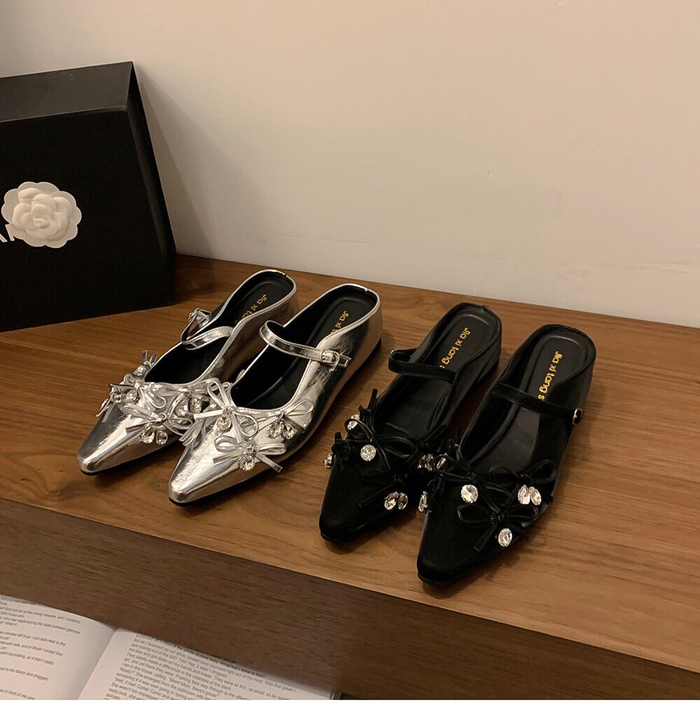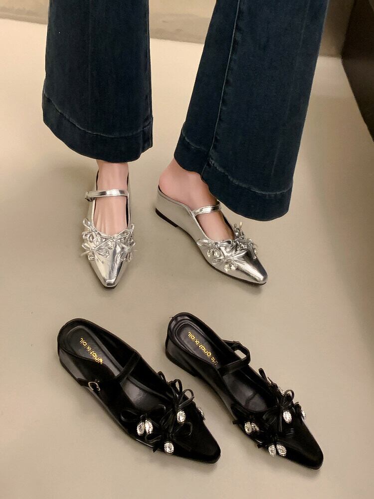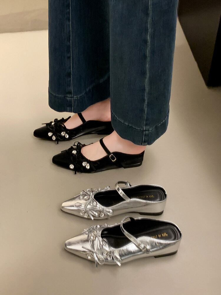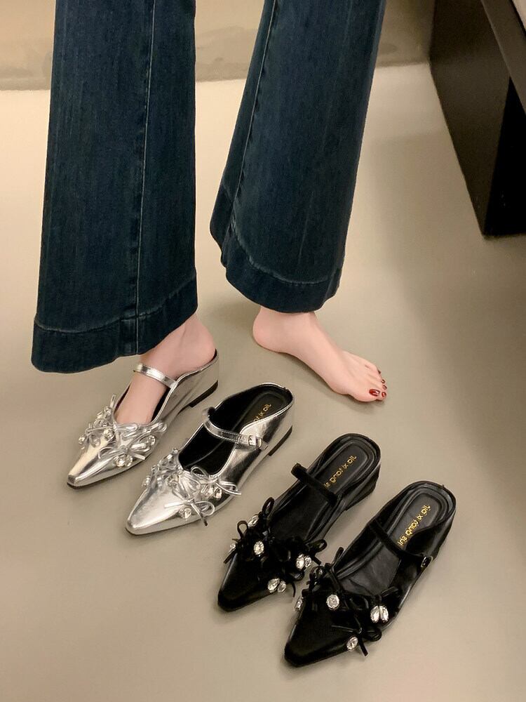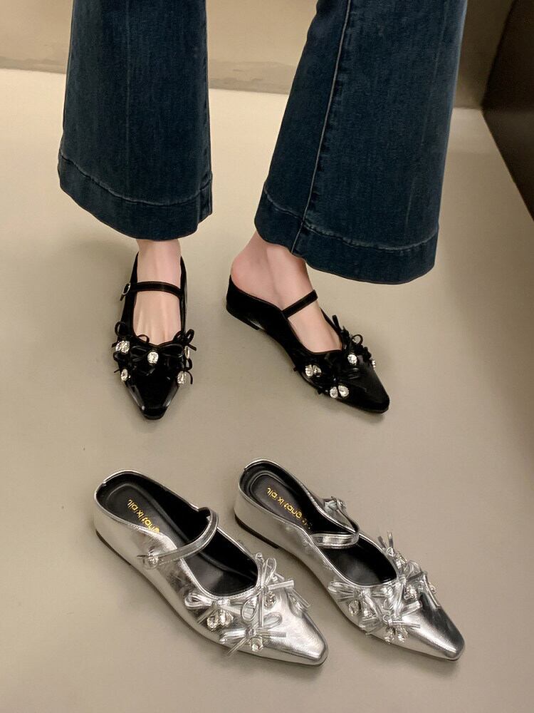 パンプス レディース フラットシューズ ぺたんこ ポインテッドトゥ ビジュー リボン ストラップ ミュール ローヒール ブラック シルバー 歩きやすい 大人可愛い きれいめ 韓国 ファッション 春 夏 秋 2カラー C372