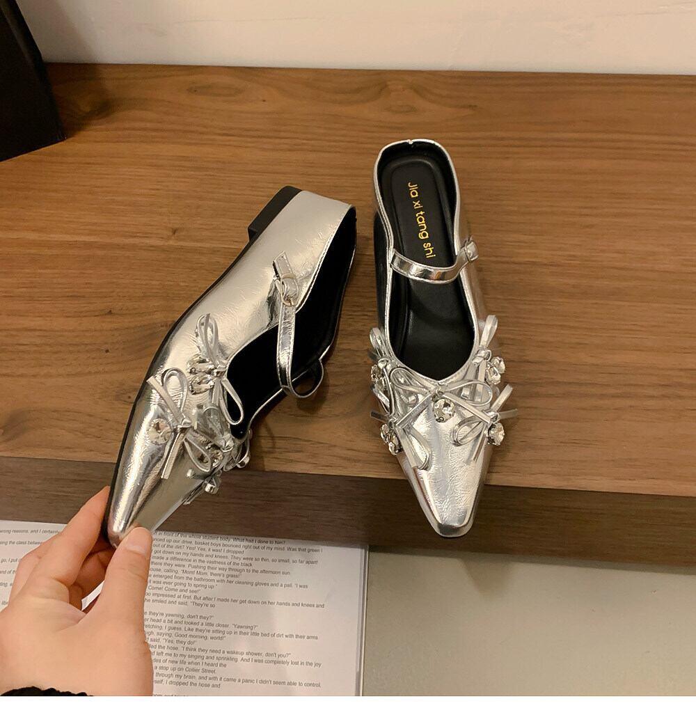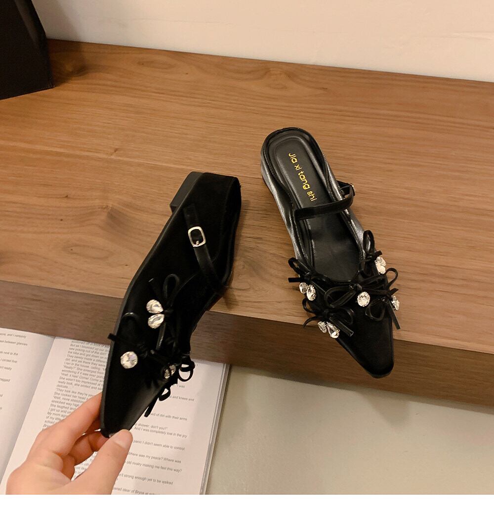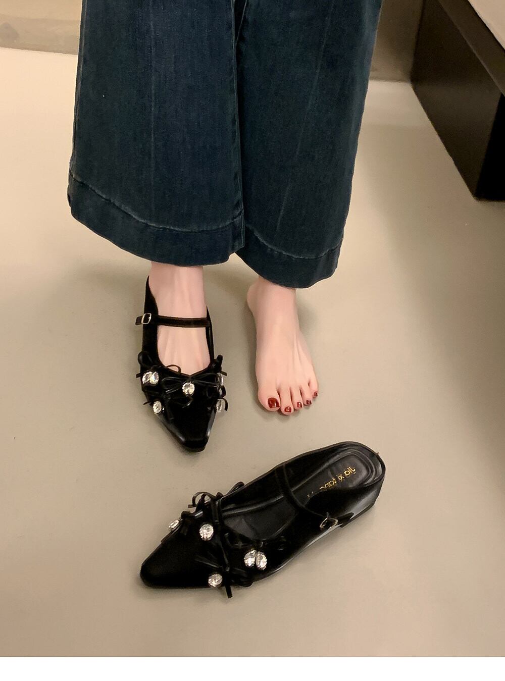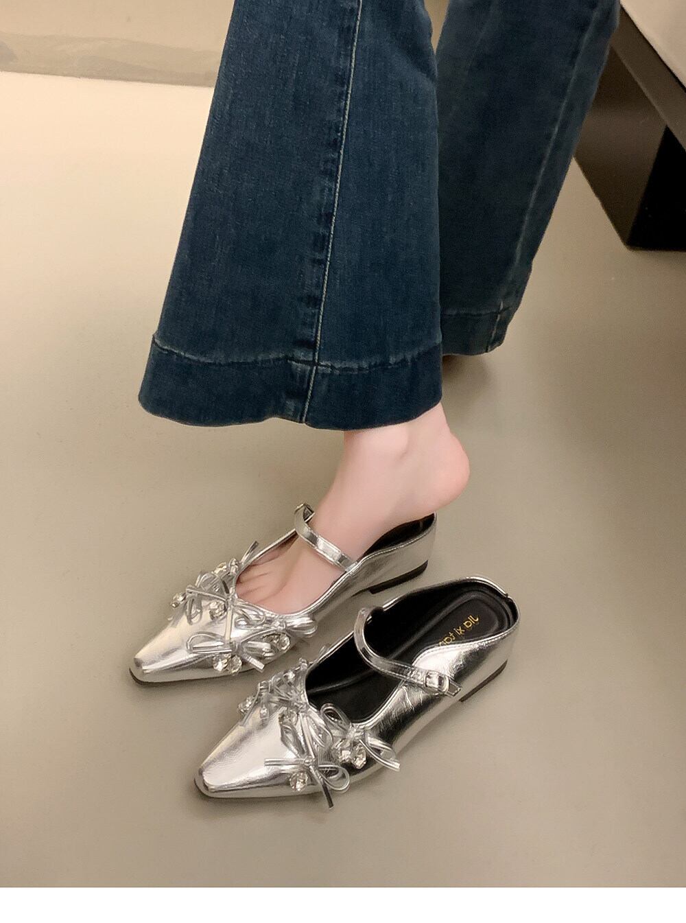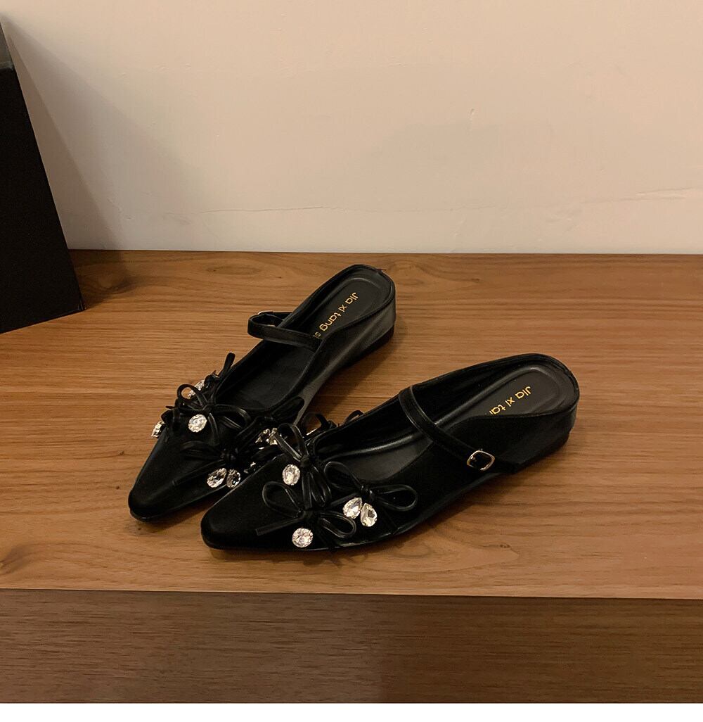 パンプス レディース フラットシューズ ぺたんこ ポインテッドトゥ ビジュー リボン ストラップ ミュール ローヒール ブラック シルバー 歩きやすい 大人可愛い きれいめ 韓国 ファッション 春 夏 秋 2カラー C372