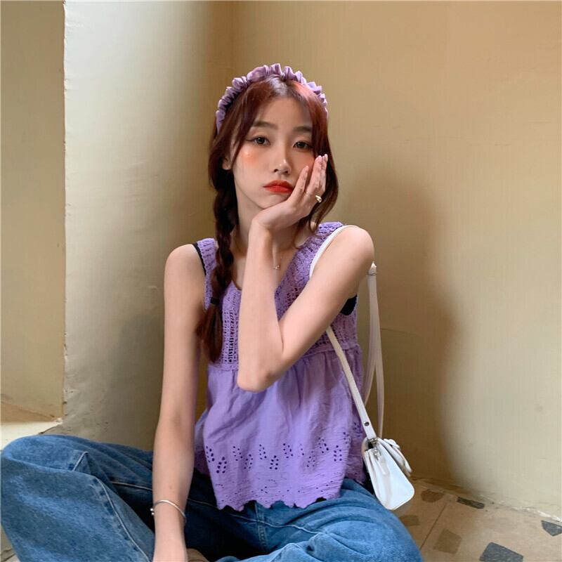デコルテ〜バスト部分にかけての緩編みデザインが可愛いノースリーブです。