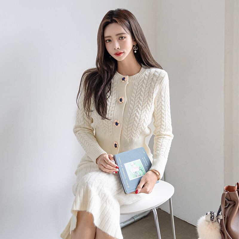 カーディガンのボタンがお花になってるのも可愛いポイント!