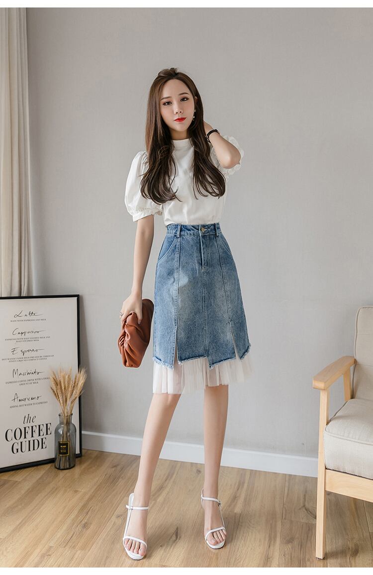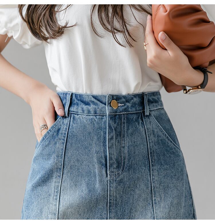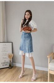 ハイウエストデニムスカートの下にシフォン生地が可愛いAラインスカートです。