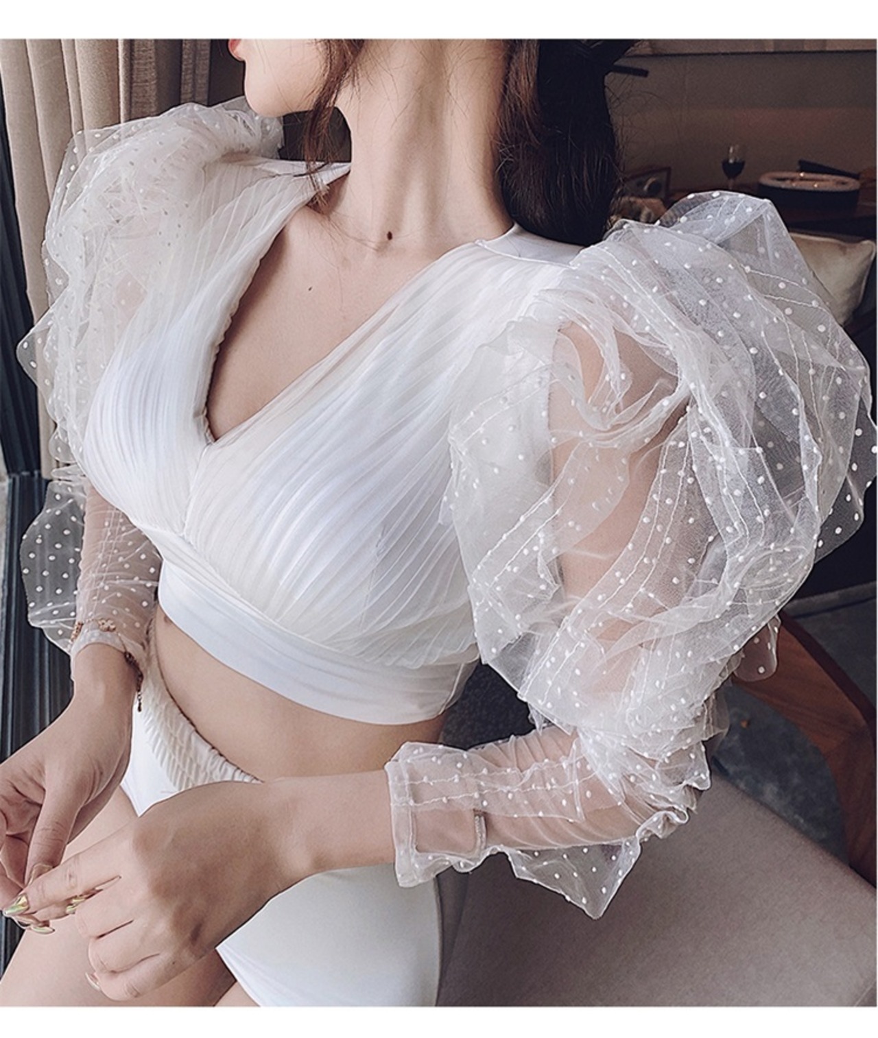 長袖シフォンにドット柄が可愛いバブルスリーブ袖のビキニです。