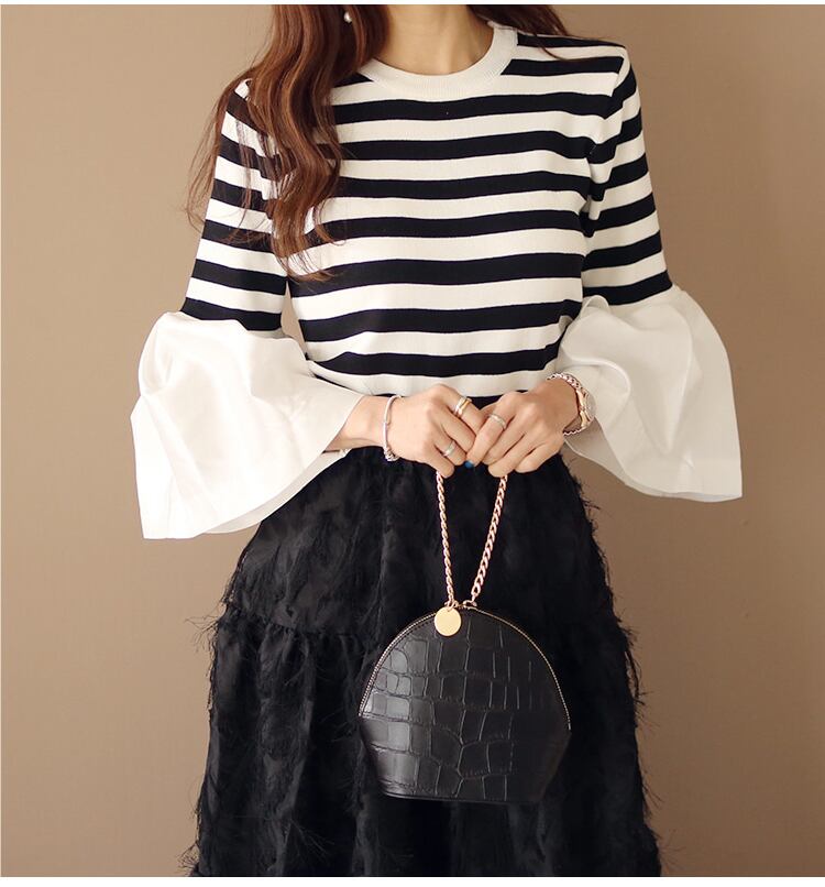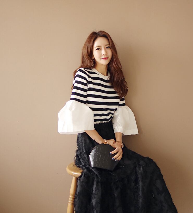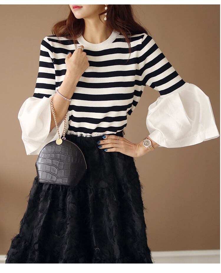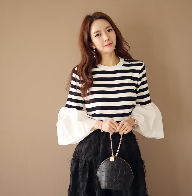 異素材ミックスニットTシャツ ワイドスリーブ プルオーバー ふんわり袖 ボーダー ストライプ 七分袖 ベルスリーブ フェミニン エレガント おしゃれ トップス レディース トレンド カジュアル 普段着 デイリー 通学 通勤 デート ビジネス オフィス お出かけ ショッピング 女子会5カラー b289