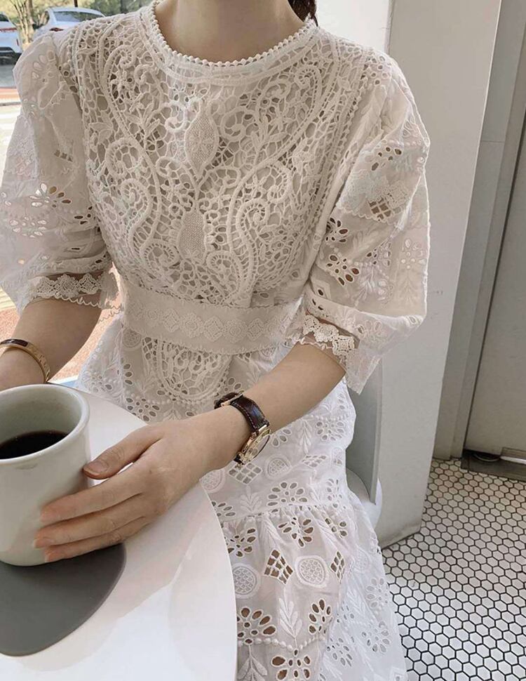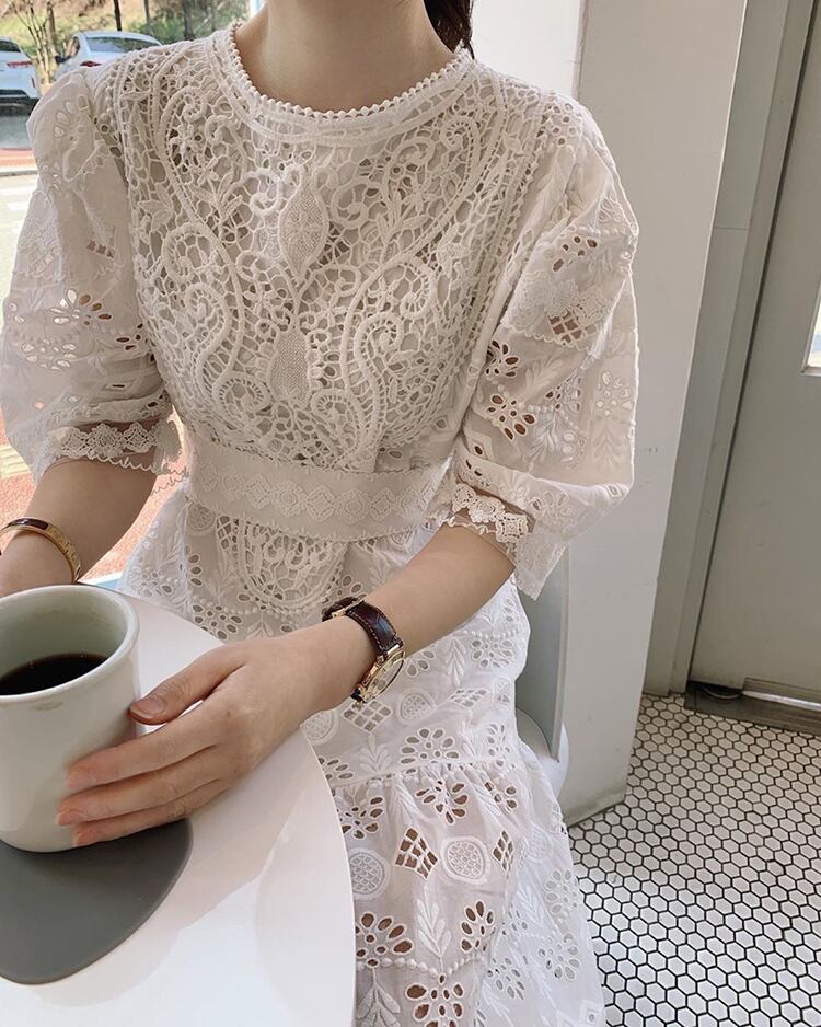 袖まで細かくデザインされたパンチングレースワンピースです。