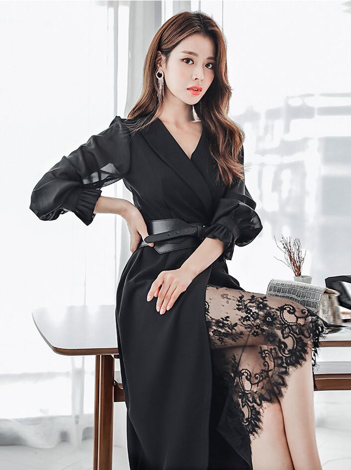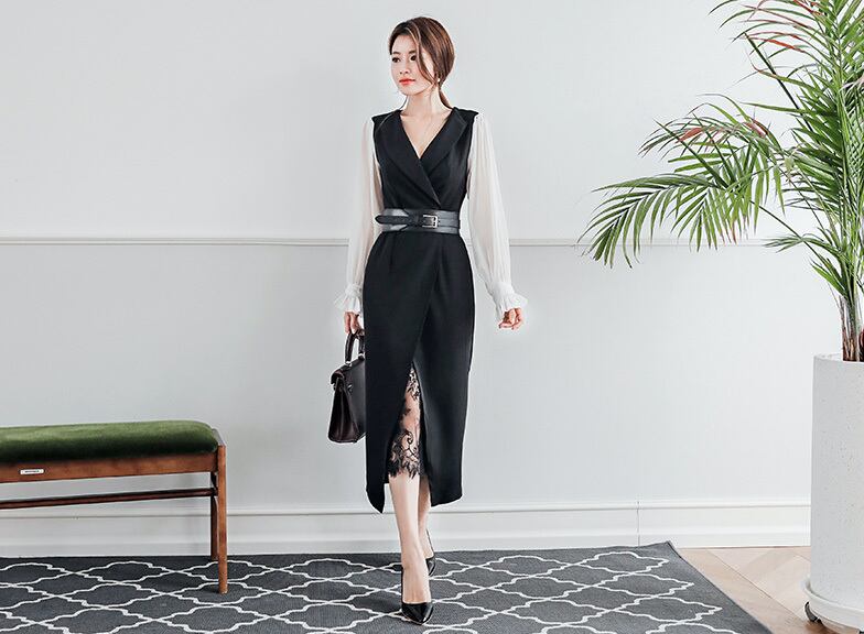 Vネックシフォンレースワンピース✴︎ベルト付 2カラー b331
