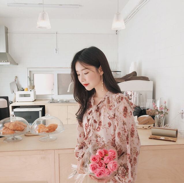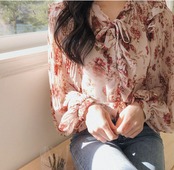 プリーツランタンスリーブ レースアップ長袖シフォンブラウス b473