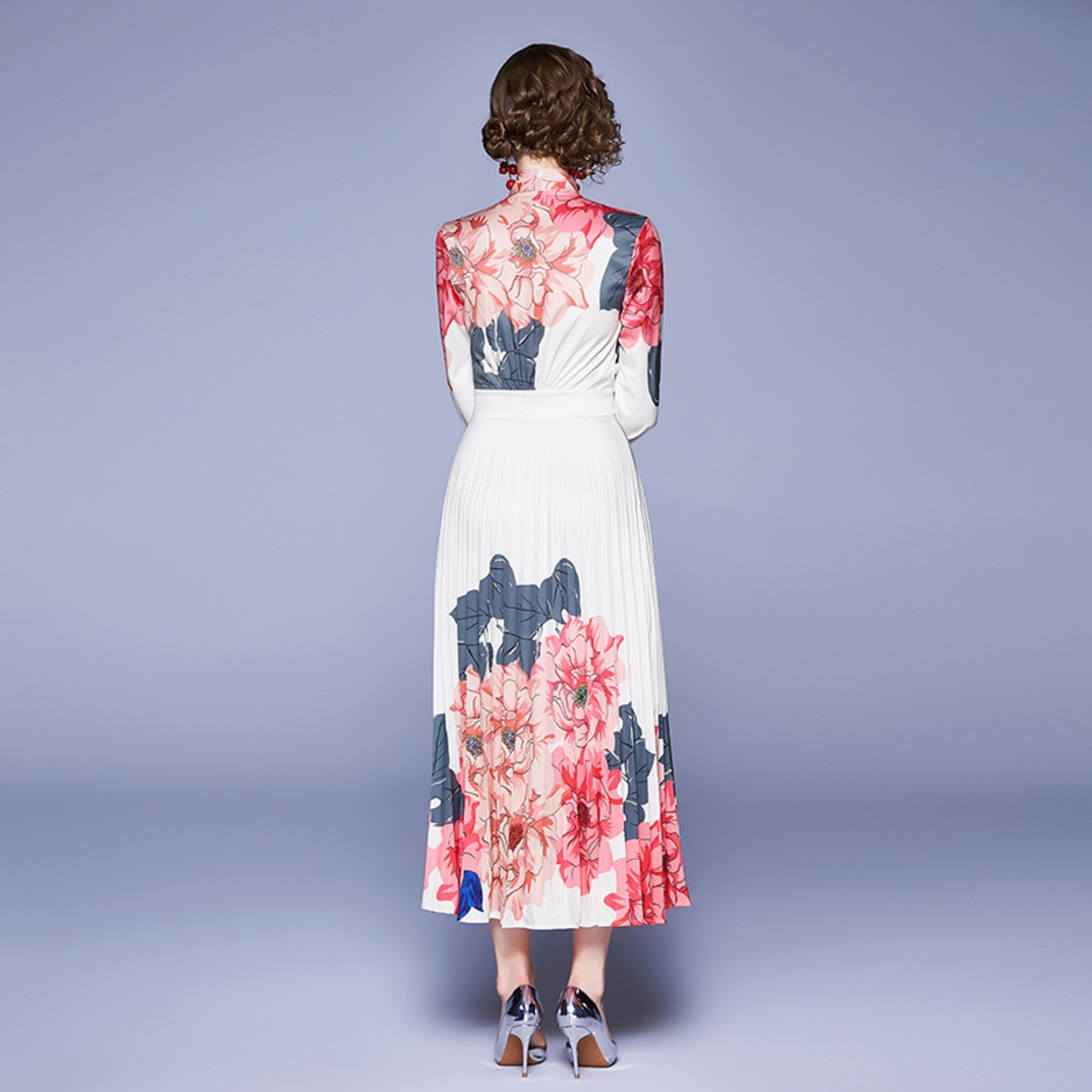 大ぶりのふわらープリントがキレイなロングワンピースです。