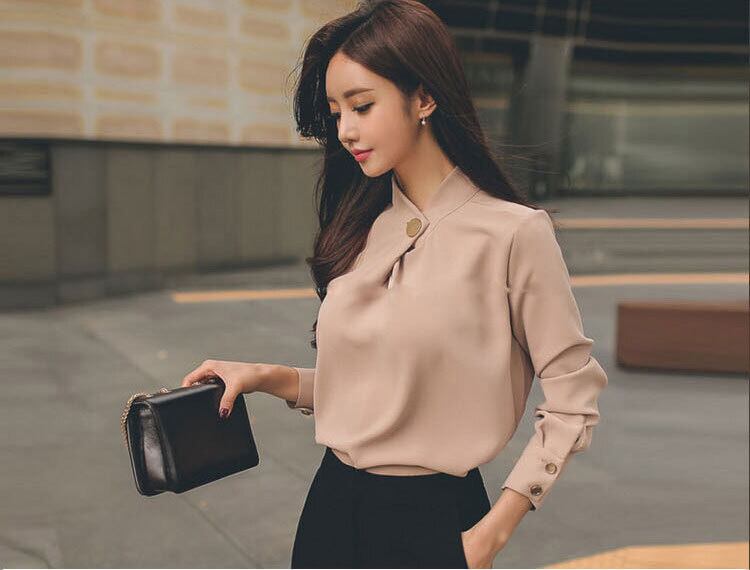 大きなボタンが印象的なキレイ目ブラウス