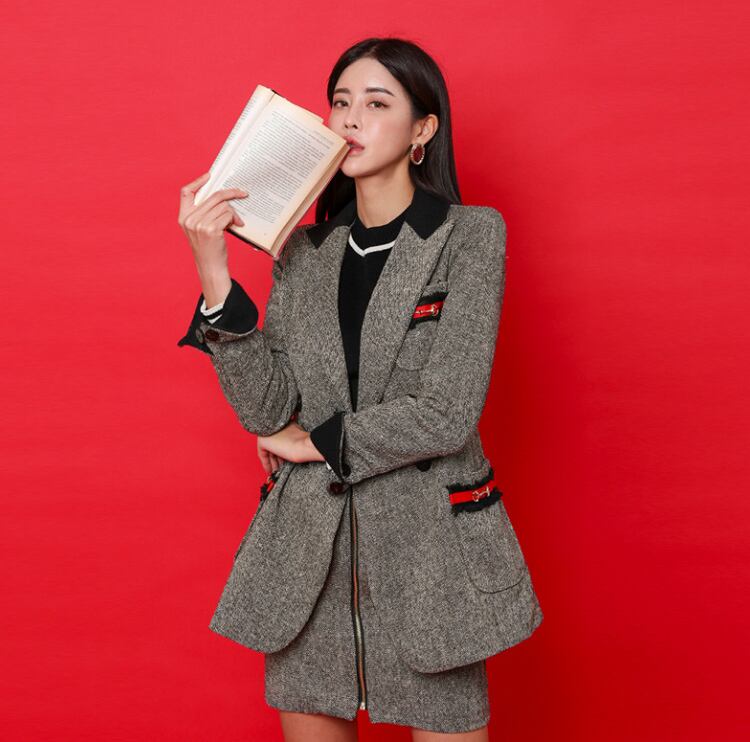 【セットアップ】ジャケット+ハイウエストショートスカート グレー ツーピーススーツ b489