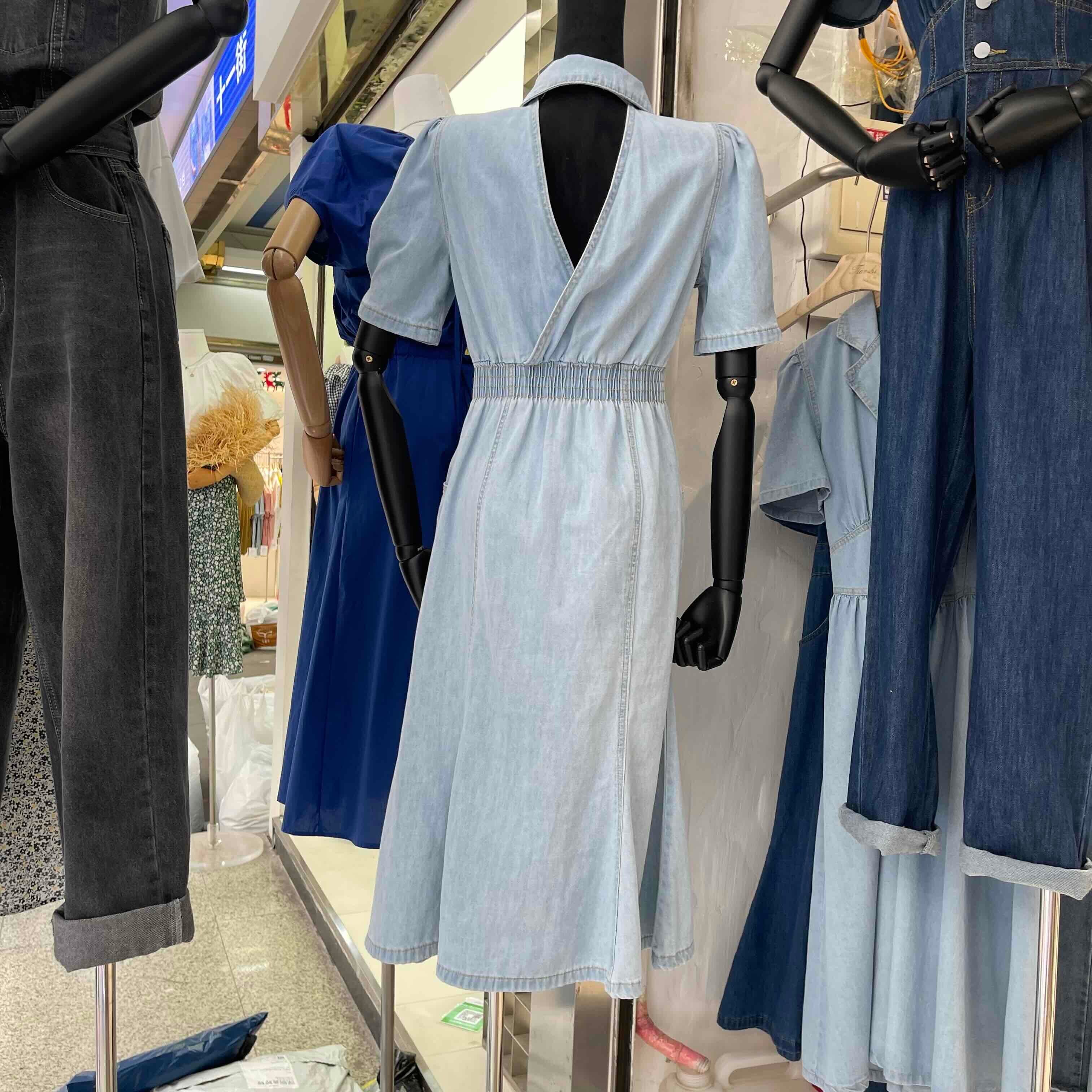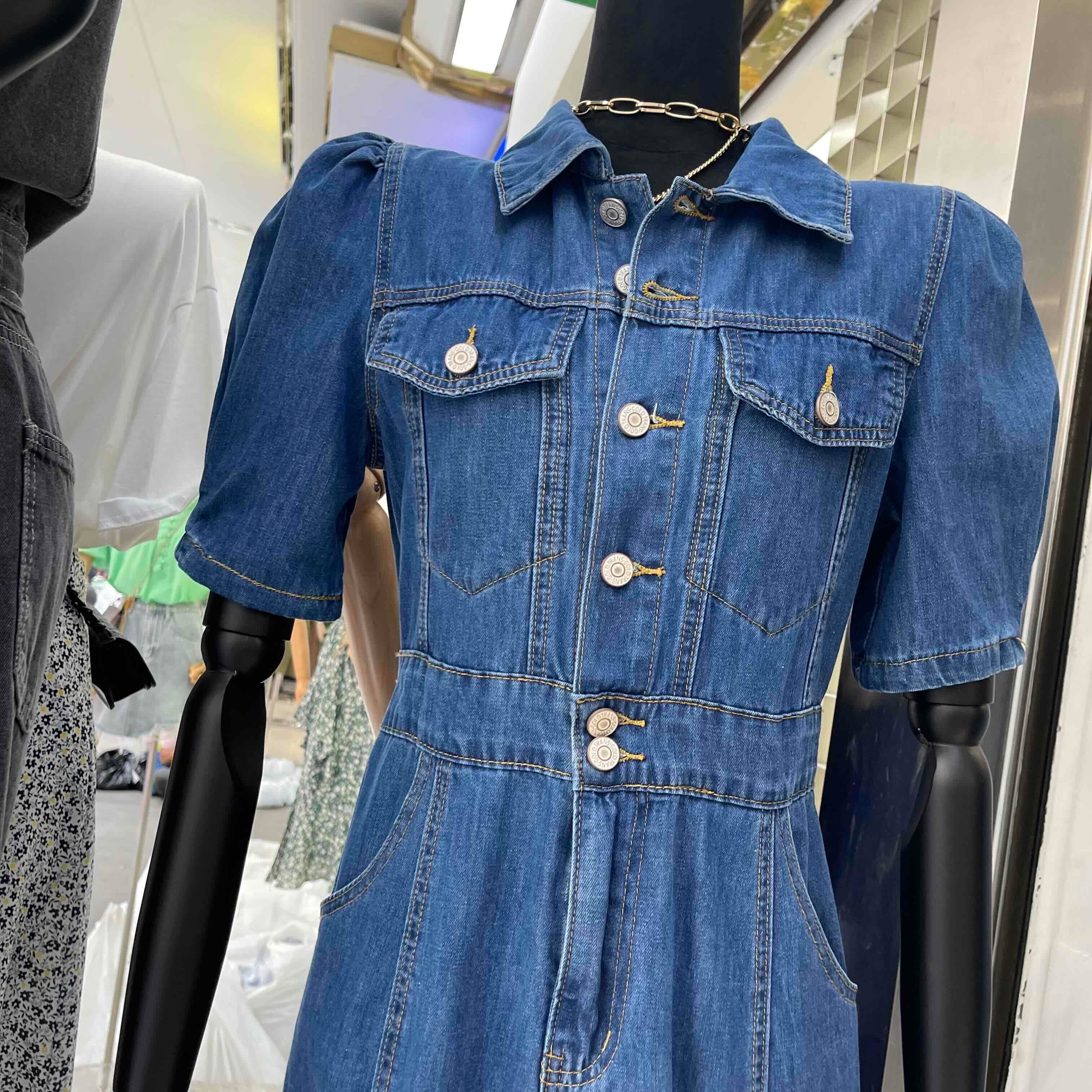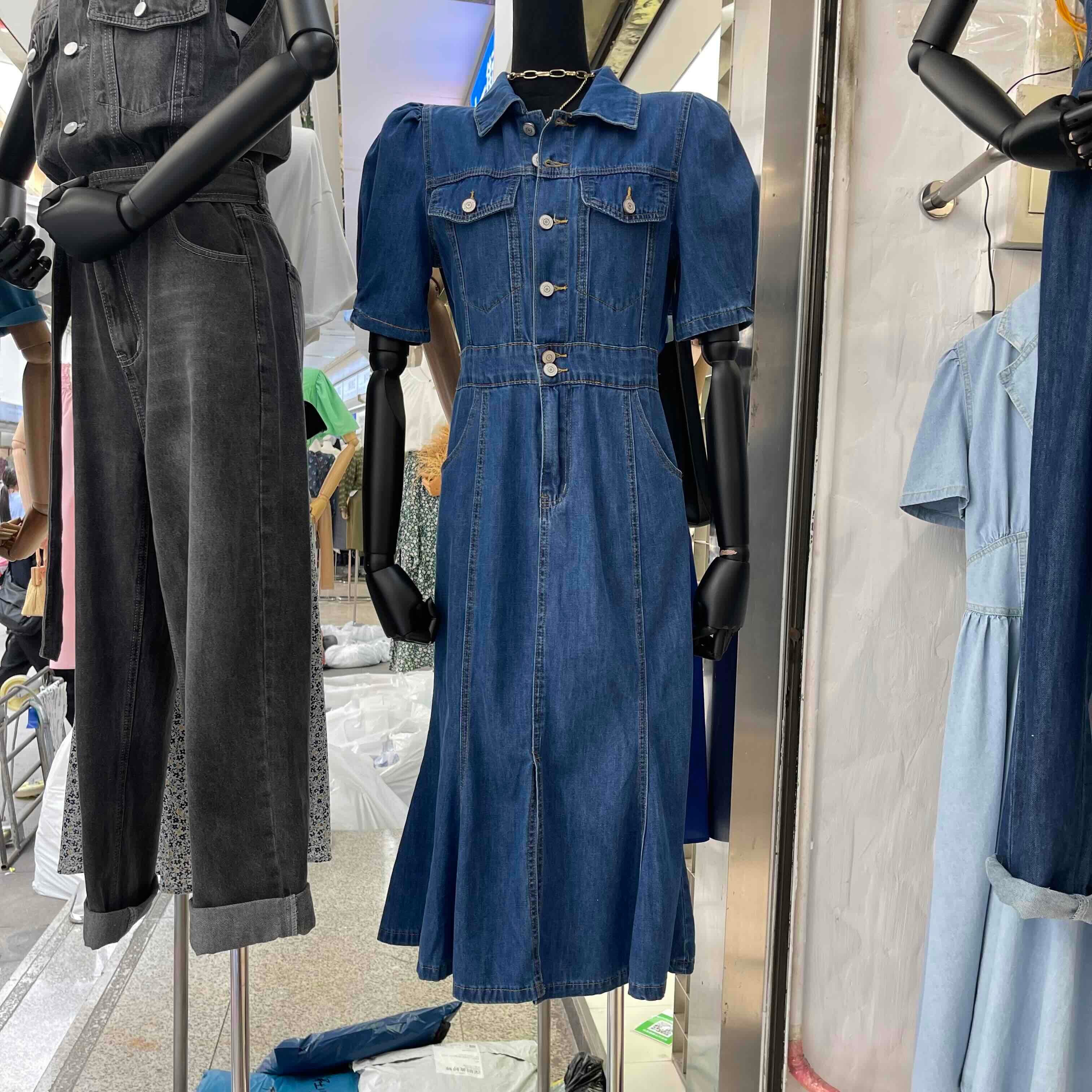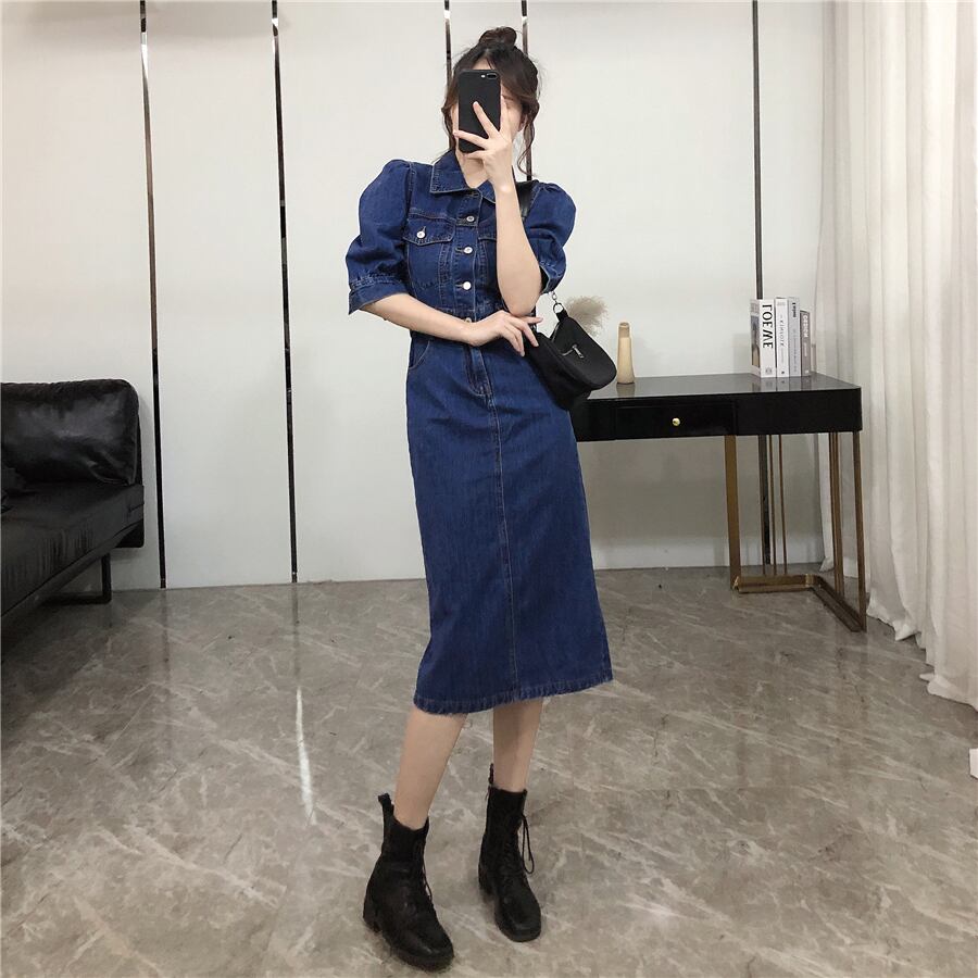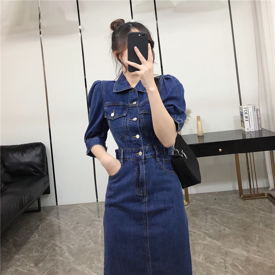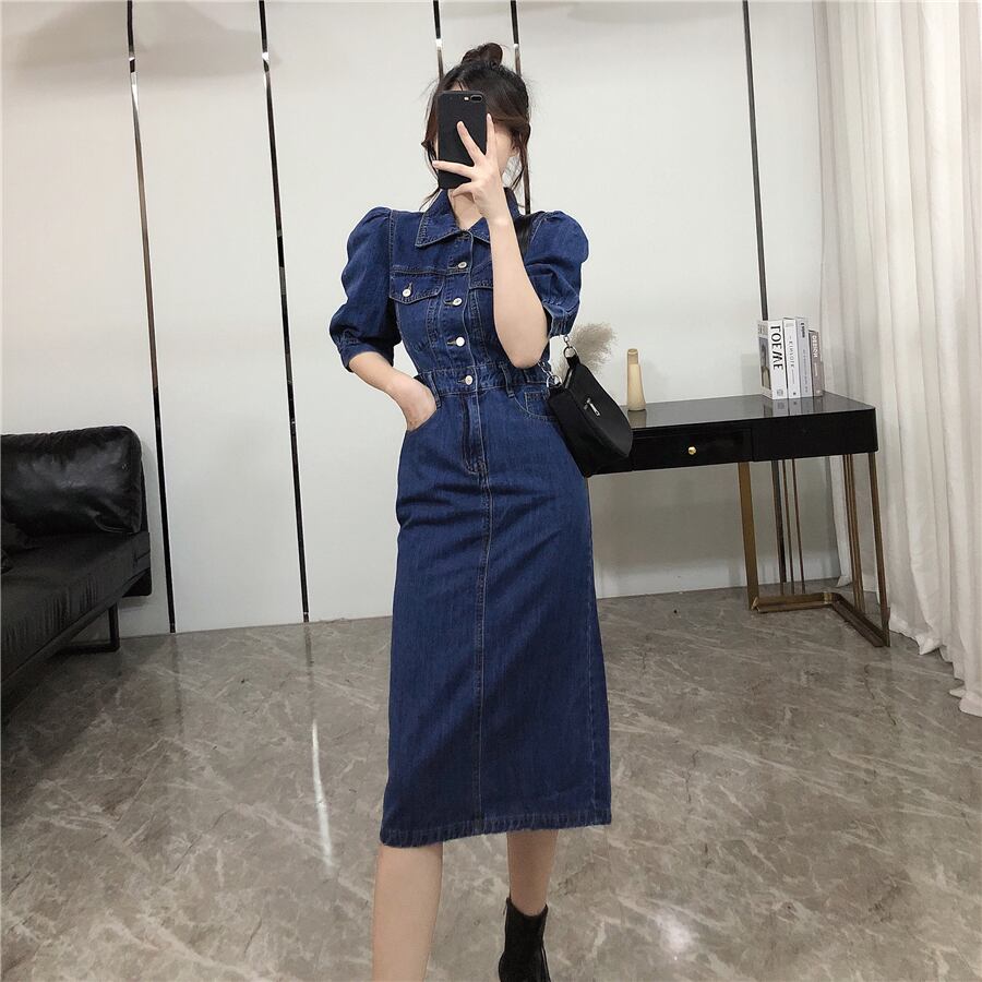 ハイウエスト シングルブレスト デニム ワンピース ミドル丈スカート b488