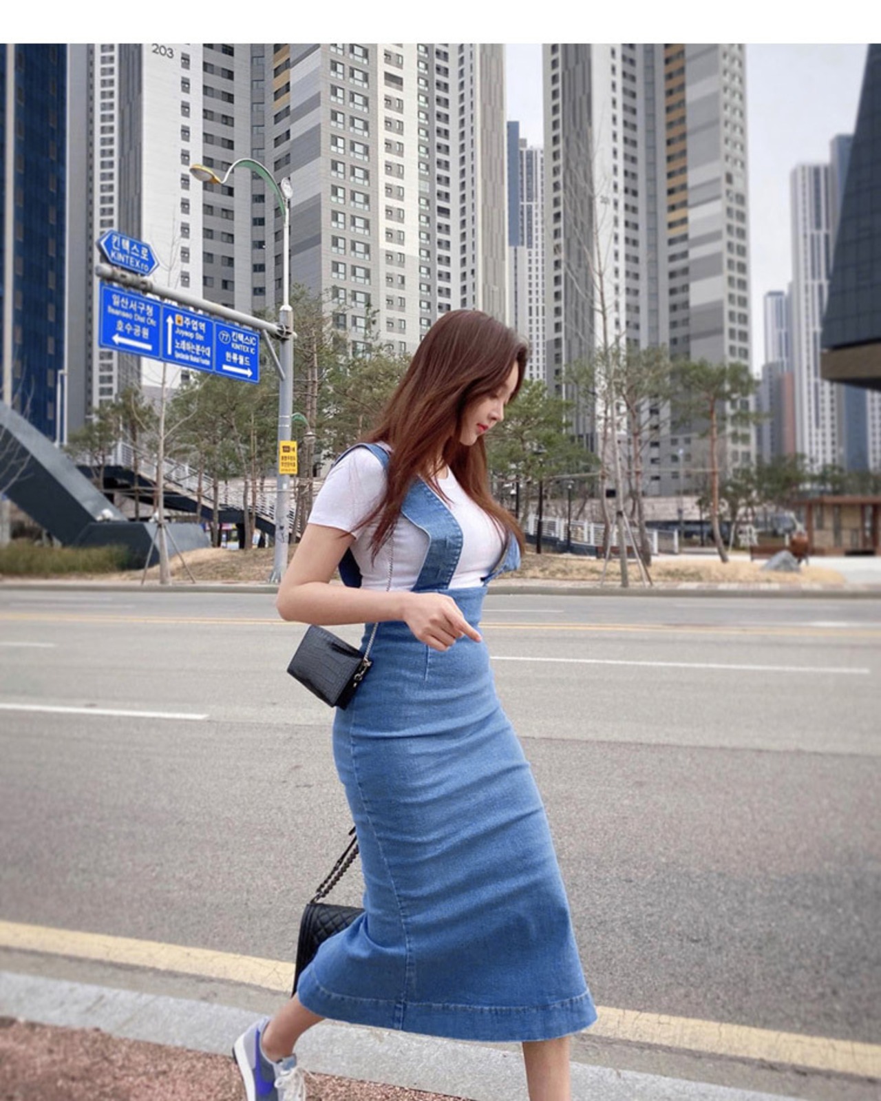 タイトなデニムサスペンダースカート