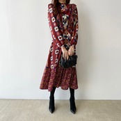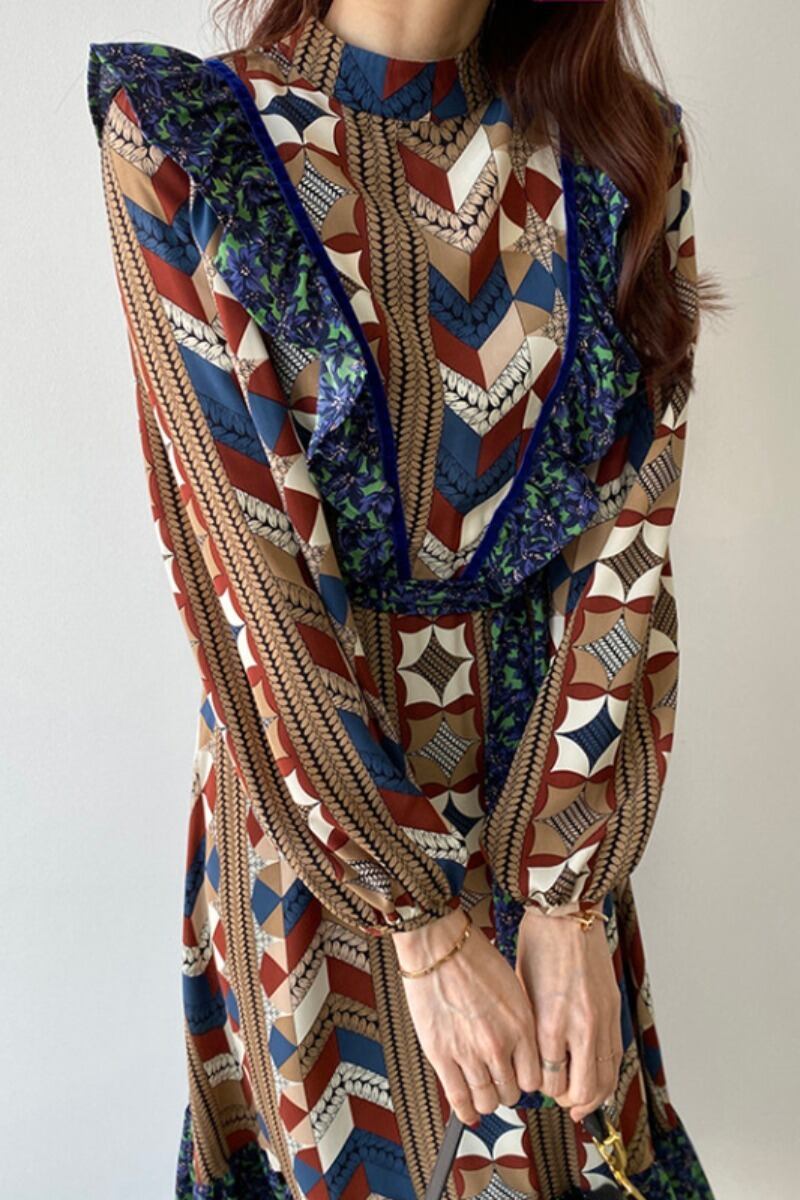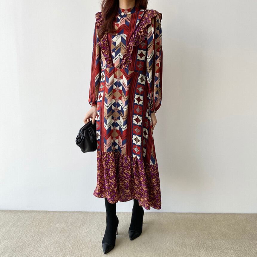フリルワンピース エスニック風 ショルダーフリル ロングワンピース レトロ 春 秋 ハイネック 花柄 b483