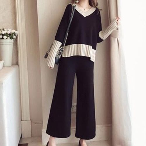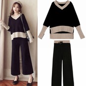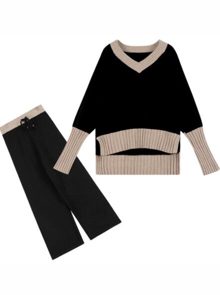 【セットアップ】パンツスーツ+長袖セーター 上下セット ワイドレッグパンツ おしゃれ A1748