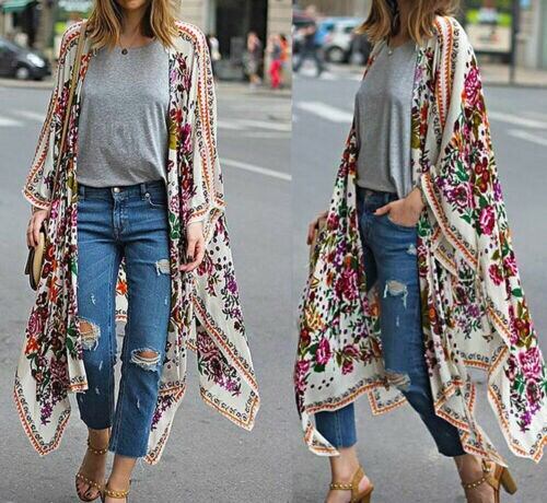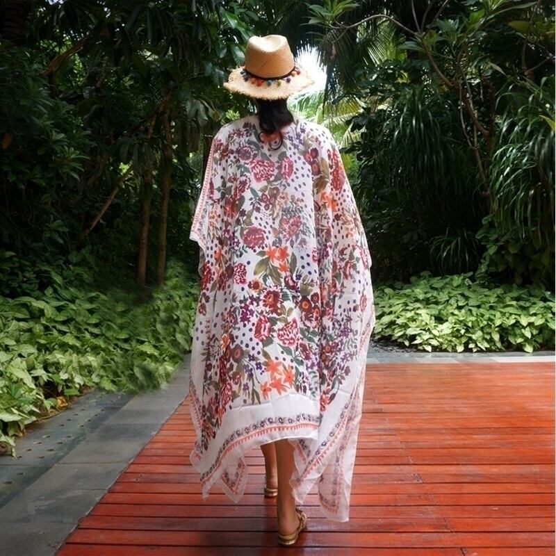 女性シフォン 着物カーディガン 花プリントアシンメトリー Bohoルーズアウターウェア ビーチウェアビキニカバーアップ A3