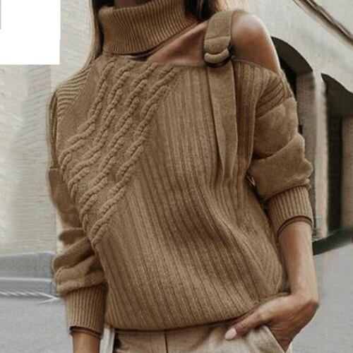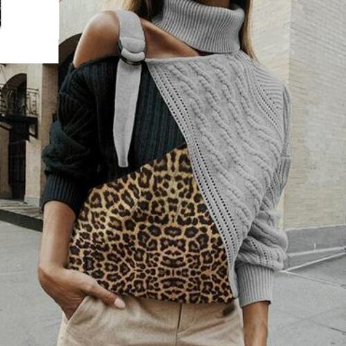 ヒョウ柄 パッチワーク タートルネック セーター オフショルダーニット トップス A1759