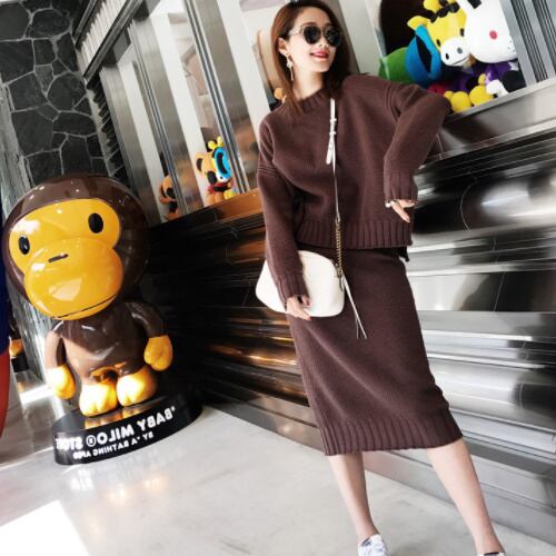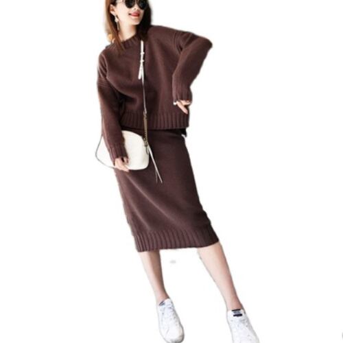 【セットアップ 】ハイネック アシメ スリット入 ニットトップス セーター+スリット入 ニットロングスカート A1763