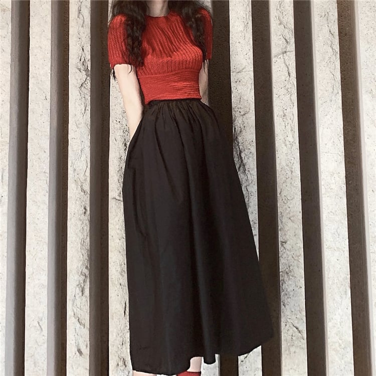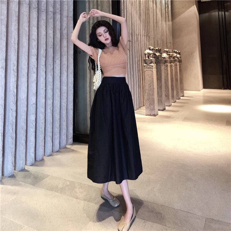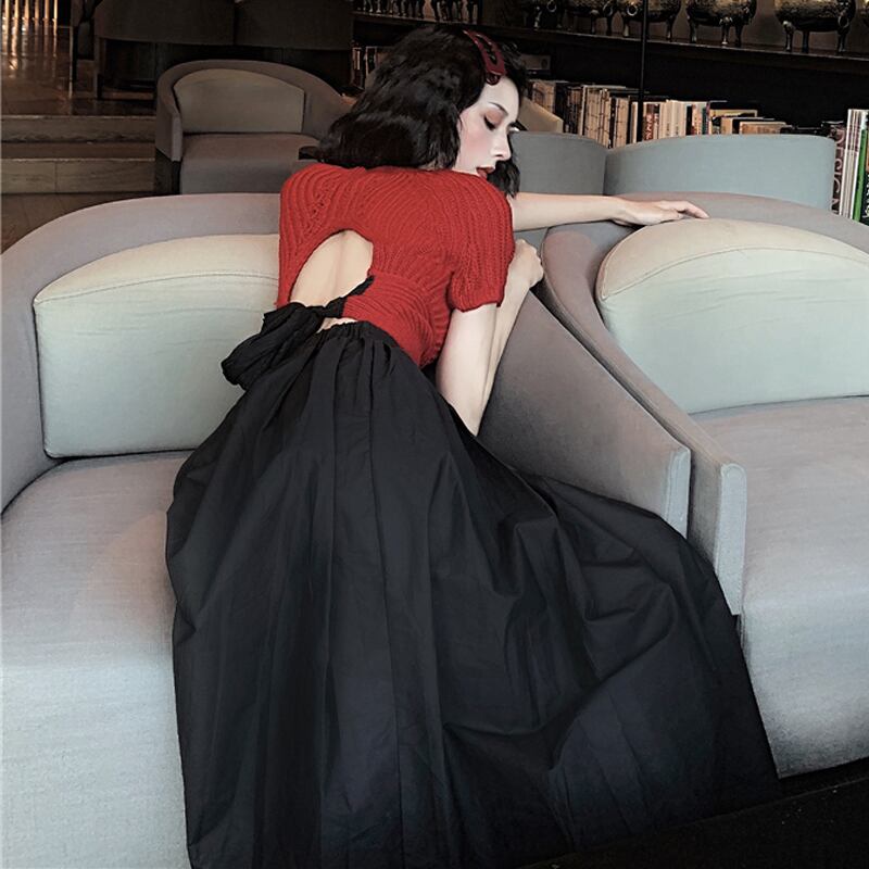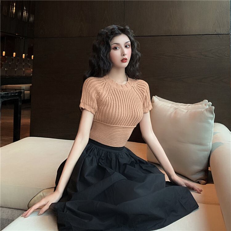バックリボンニット プルオーバー ハーフレングスのスカート ハイウエスト トップス 2カラー b538