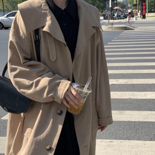 シンプルなロングコートはオーバーサイズで着ると