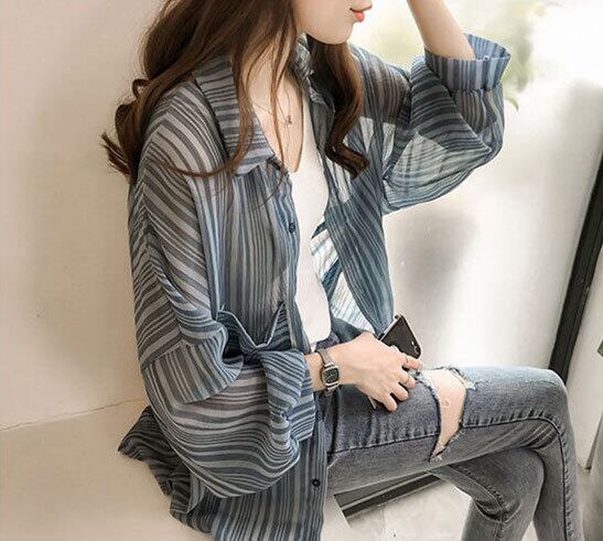 ストライプシャツ シフォンシャツ ルーズ ブラウス バルーンスリーブ 袖 3カラー a51