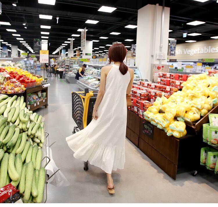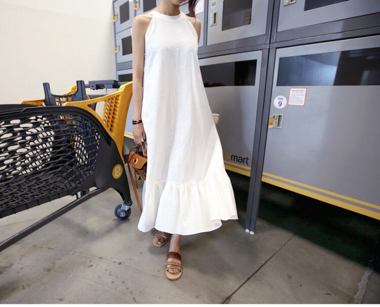 ノースリーブワンピース ミドル丈 綿とリネン フィッシュテール ロングスカート ラウンドネック a232