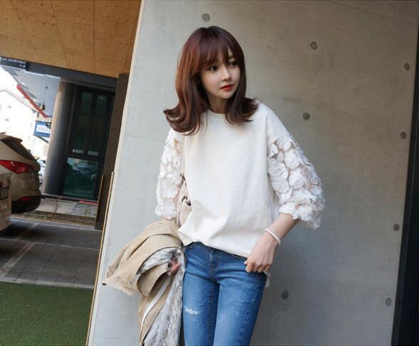 レディース Tシャツ カットソー フラワー 無地 綿 七分袖 花柄 刺繍 レース