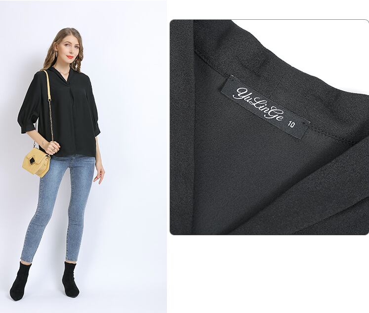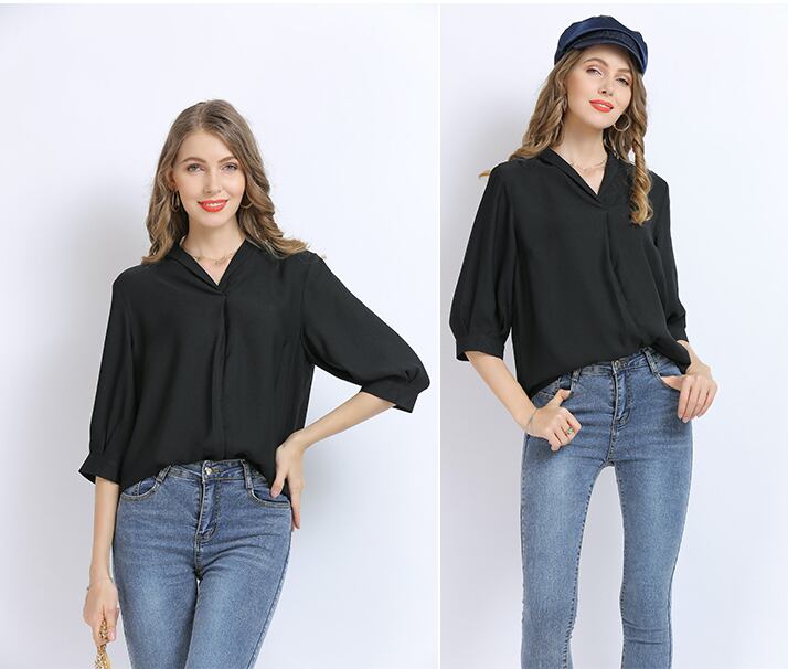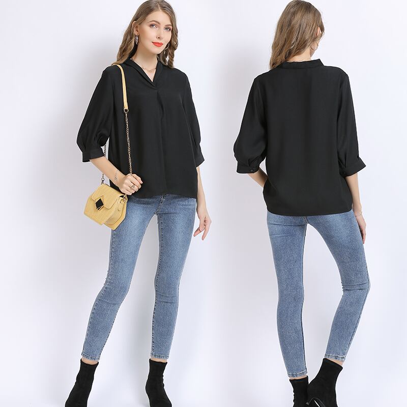 Vネック シフォンブラウス ランタンスリーブ トップス 七分袖 シャツ ブラック a259