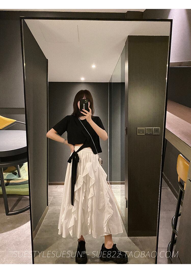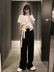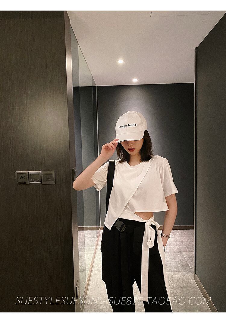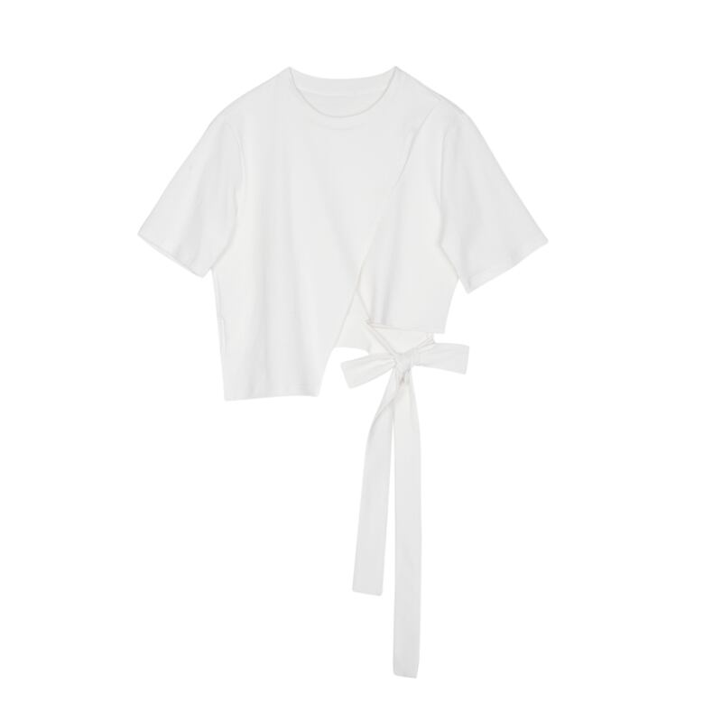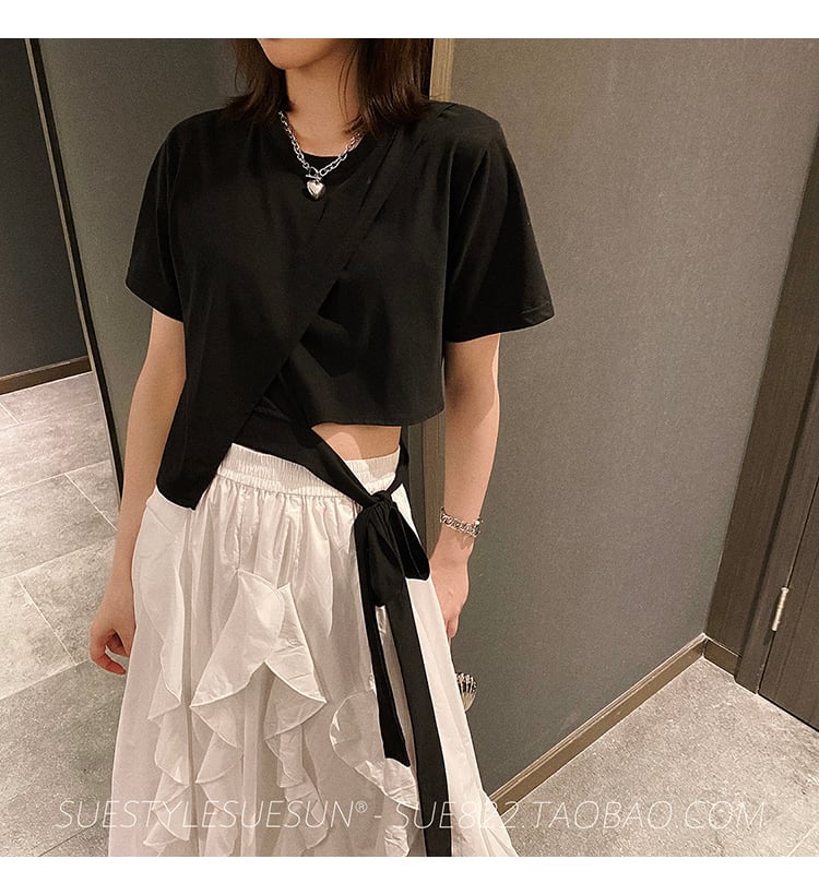 ラウンドネック ショートトップス 不規則なデザイン サイドノット付きTシャツ 2カラー a269