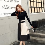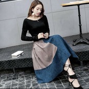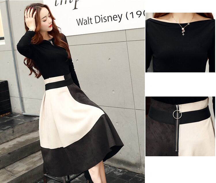バイカラーの配色デザインが印象的なミモレ丈スカートと黒のトップスの2点セットです。