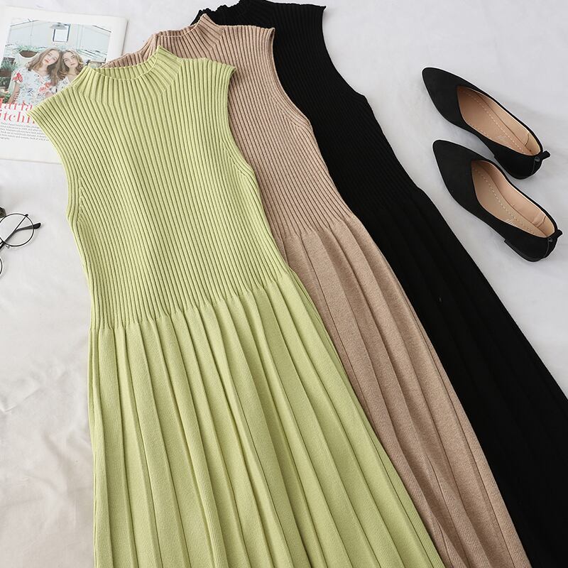 ハーフハイネック Aラインワンピース プリーツスカート レトロ ロング ノースリーブ a301