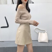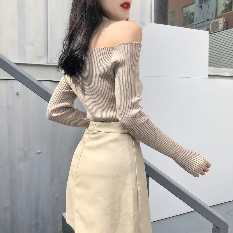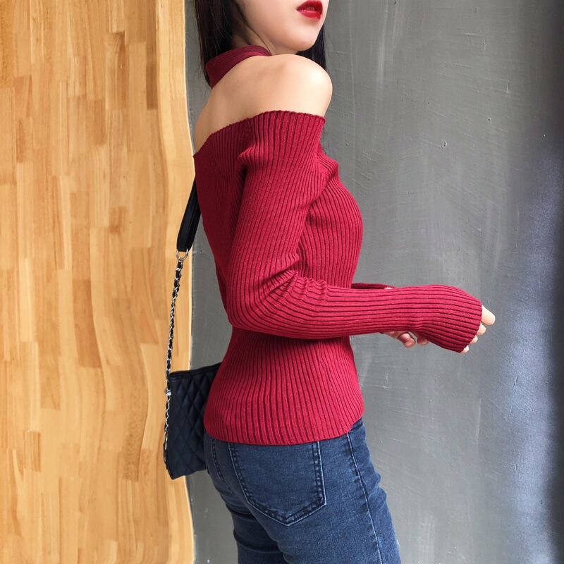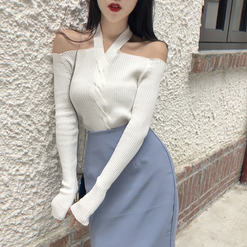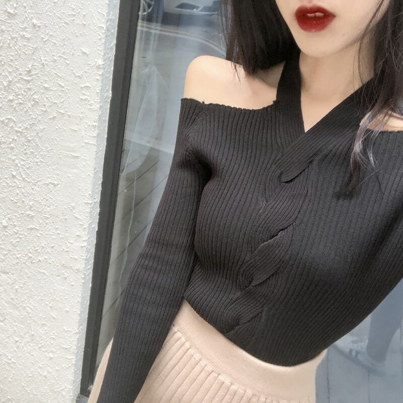 ホルターネック ストラップレス ワンウェイネック 長袖 セーター タイト 肩開き オフショル トップス a308